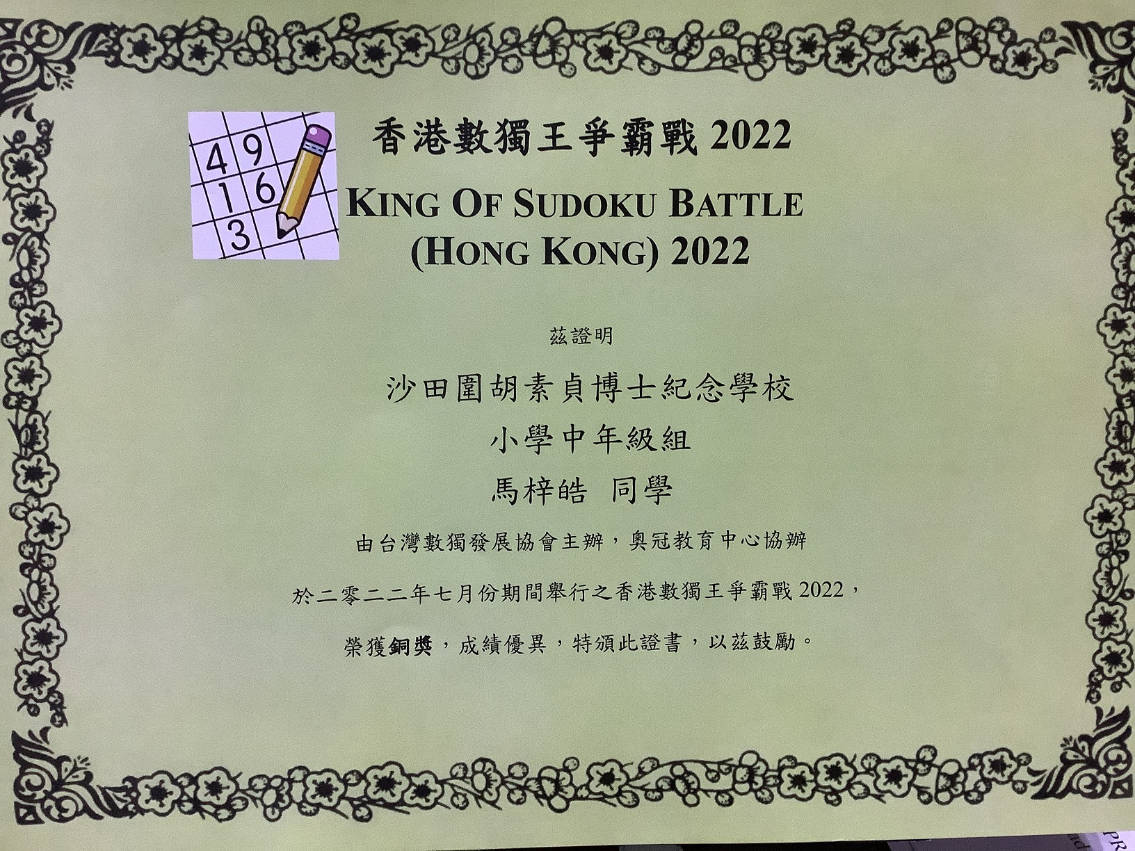 4A_馬梓皓_香港數獨王爭霸戰2022_小學中年級組_銅獎