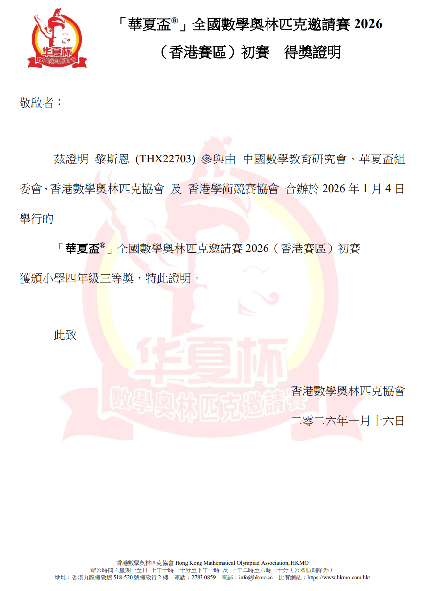 4C_黎斯恩_華夏盃全國數學奧林匹克(香港賽區)初賽_小學四年級組_三等獎