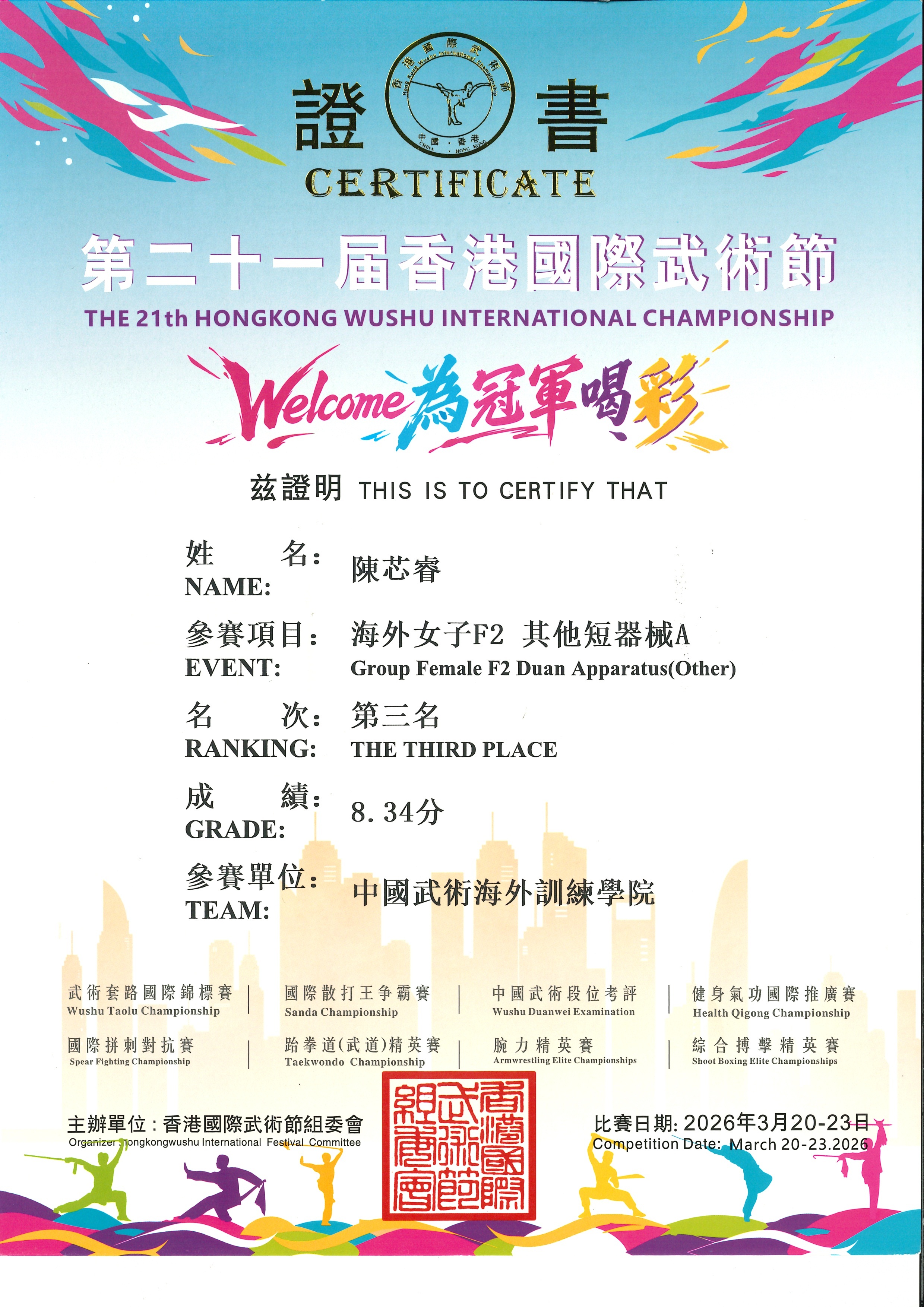 1B_陳芯睿_第二十一届香港國際武術節_海外女子F2其他短器械A_季軍