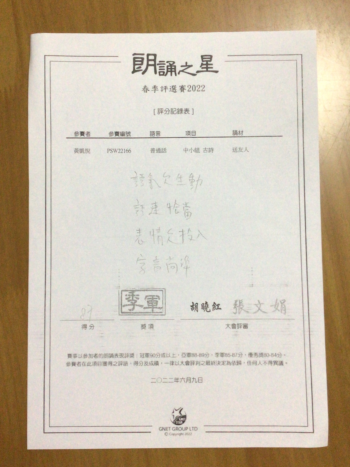 4C_黃凱悅_朗誦之星春季評選賽2022_中小組古詩_季軍