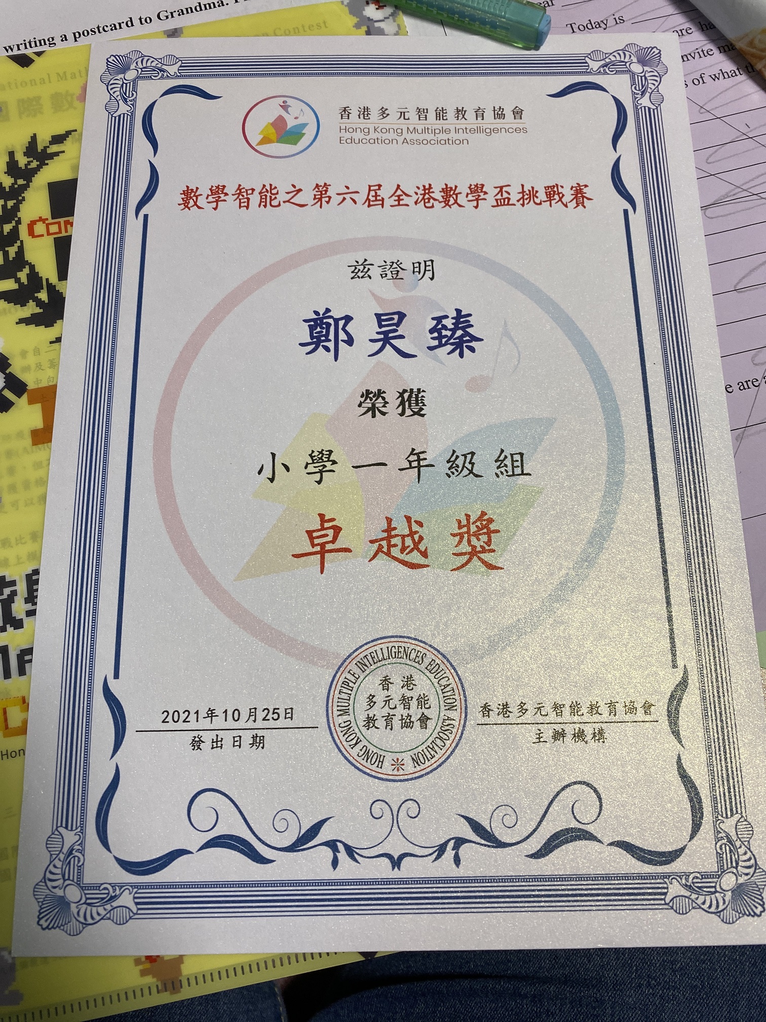 1B_鄭昊臻_數學智能之第六屆全港數學盃挑戰賽_小學一年級組_卓越獎
