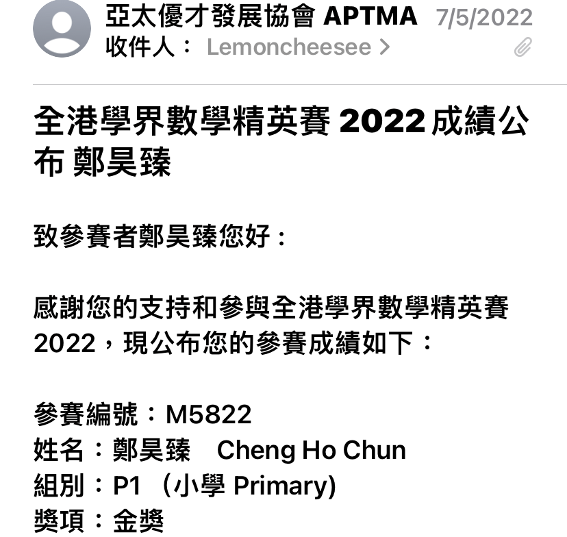 1B_鄭昊臻_全港學界數學精英賽2022小學_一年級_金獎