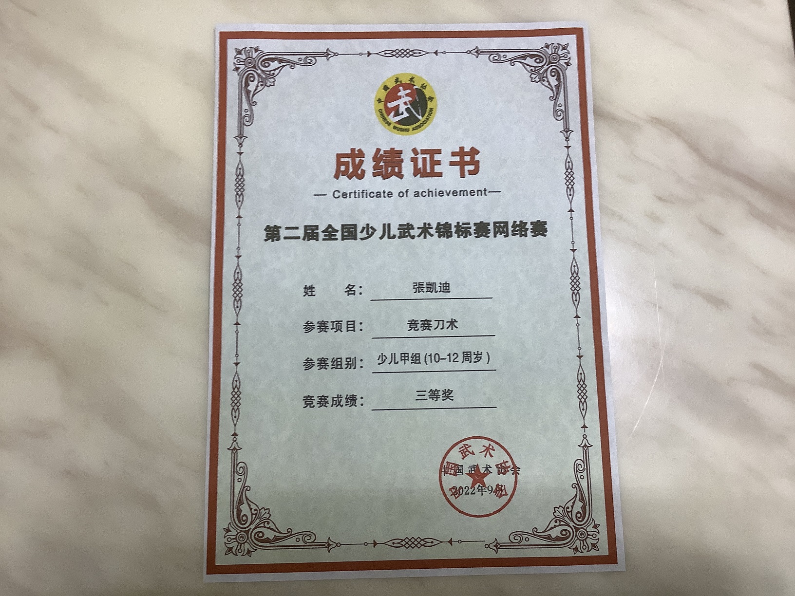 6C_張凱迪_第二屆全國小兒武術錦標賽網絡賽_少兒甲組(10—12歲)競賽刀術_三等獎