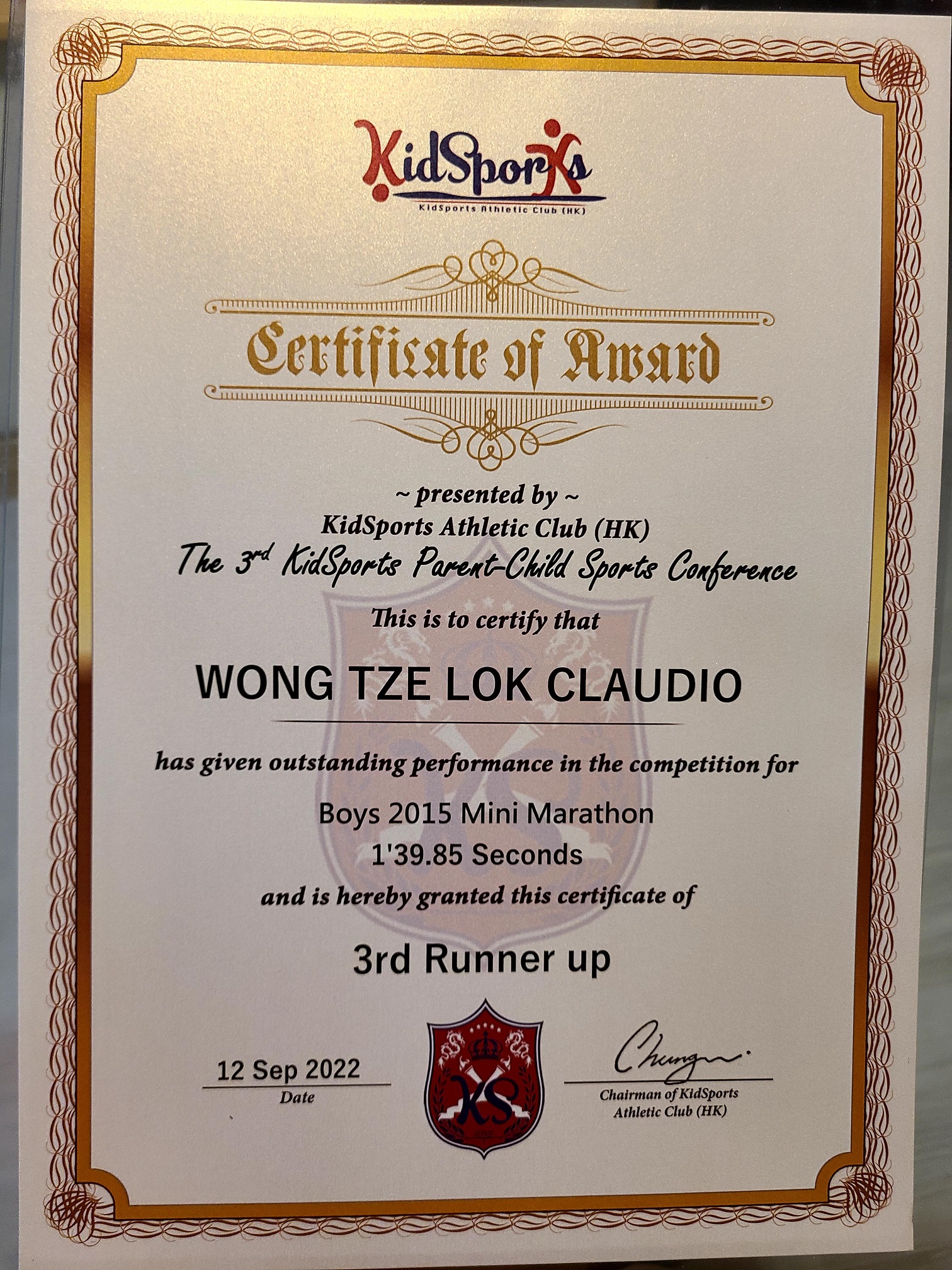 1B_王子諾_第三屆KidSports學界體育大會_2015年男子迷你馬拉松_季軍