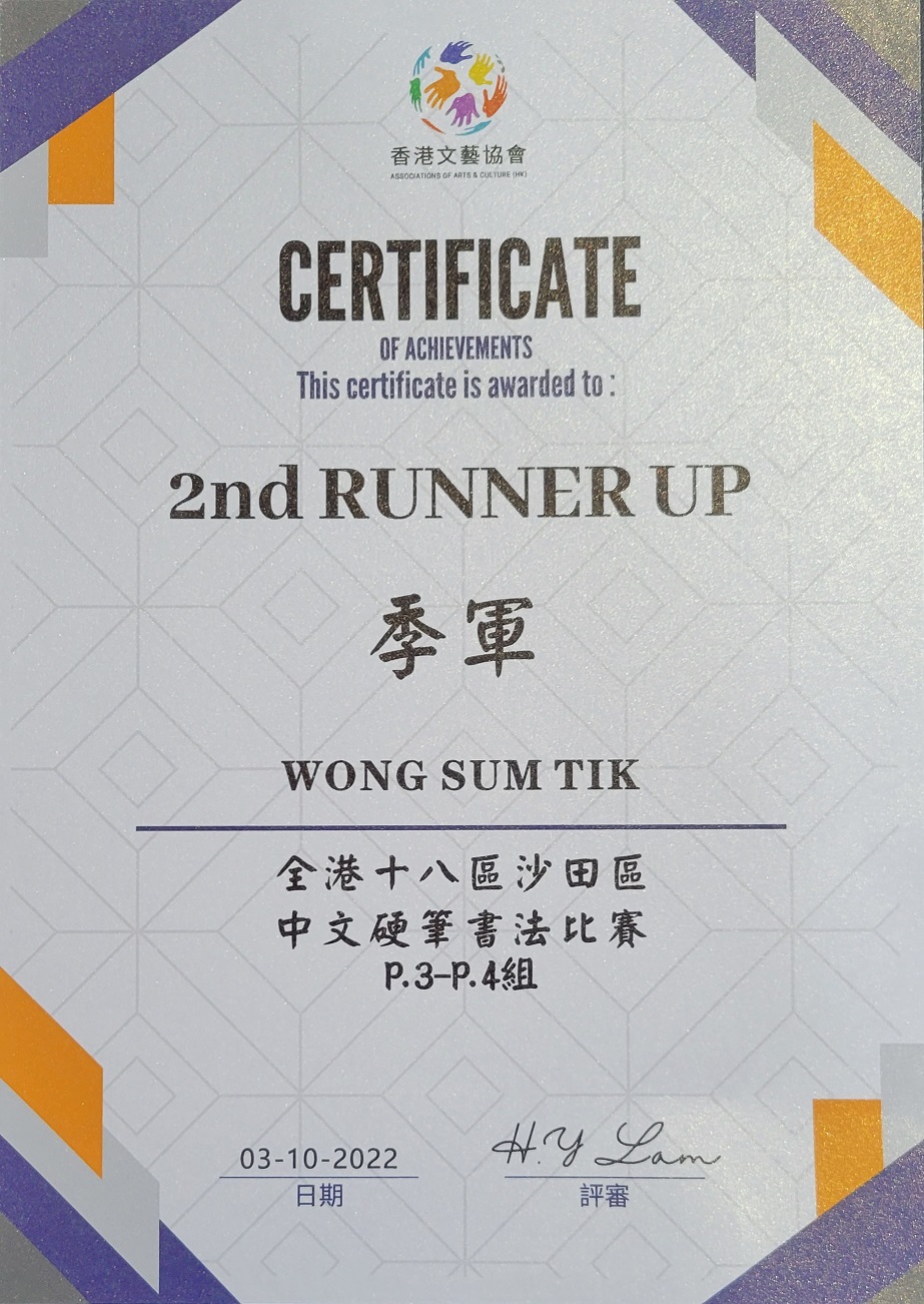 4A_黃琛迪_全港十八區沙田區中文硬筆書法比賽_小三及小四組_季軍