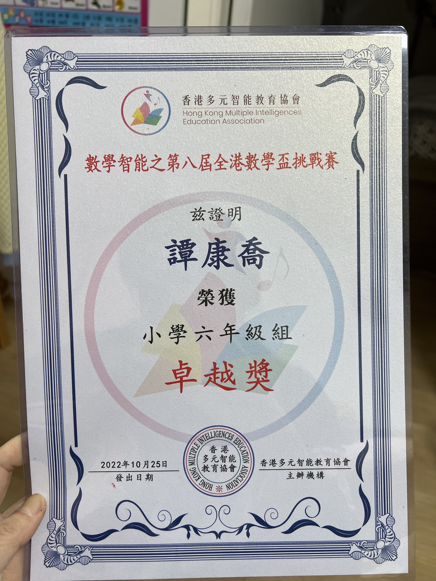 6C_譚康喬_數學智能之第八屆全港數學盃挑戰賽_小學六年級組_卓越獎