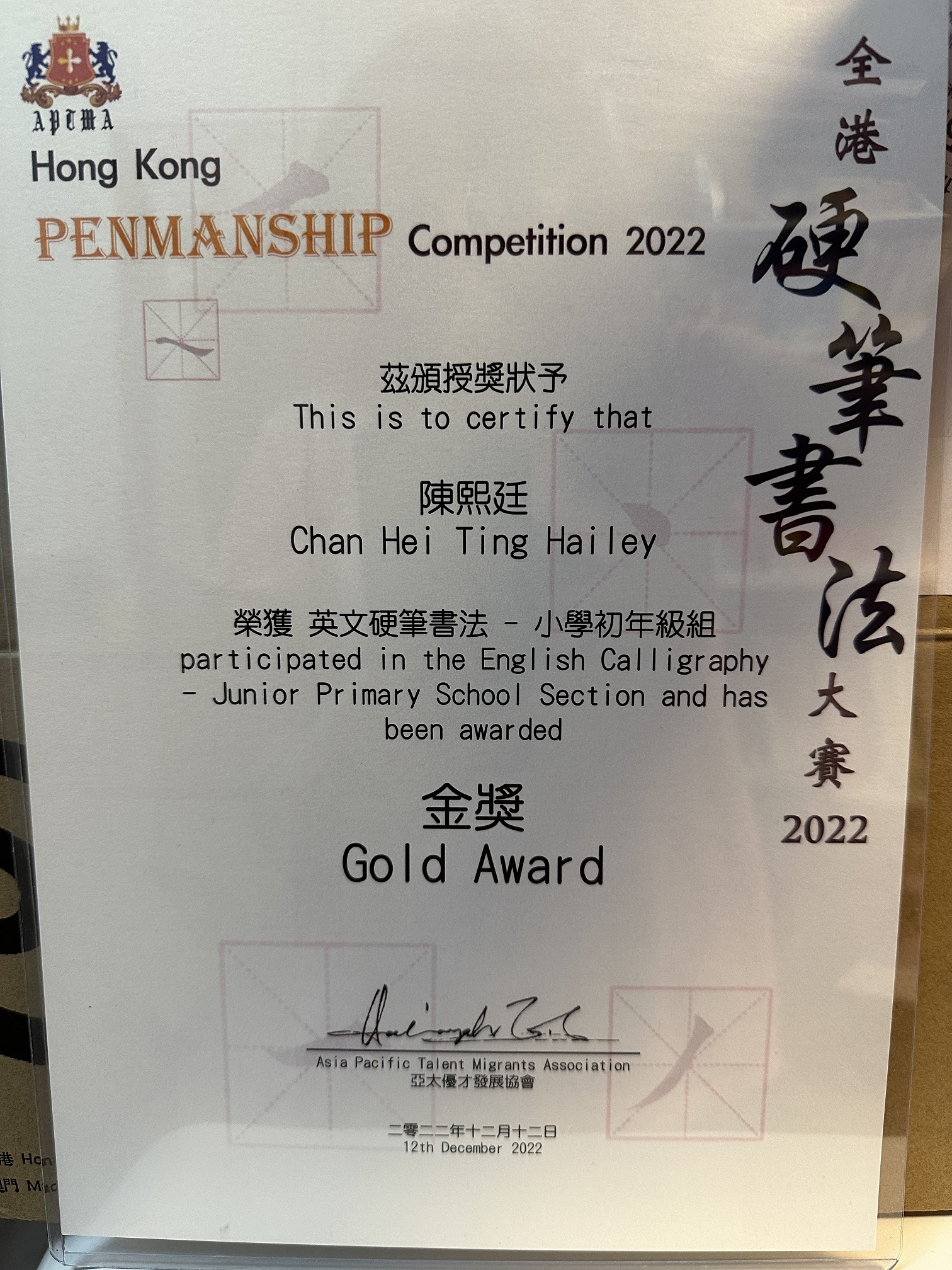 2D_陳熙廷_全港硬筆書法大賽2022_英文硬筆書法比賽小學初年級組_金