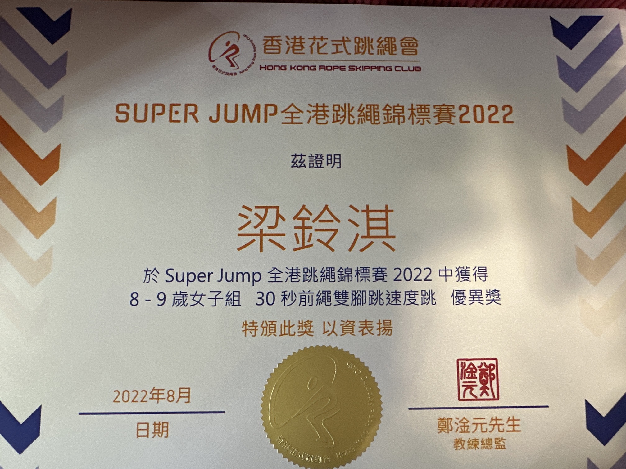 4B_梁鈴淇_SUPER JUMP 全港跳繩錦標賽2022_8~9歲女子組 30秒前繩雙腳跳速度跳_優異獎