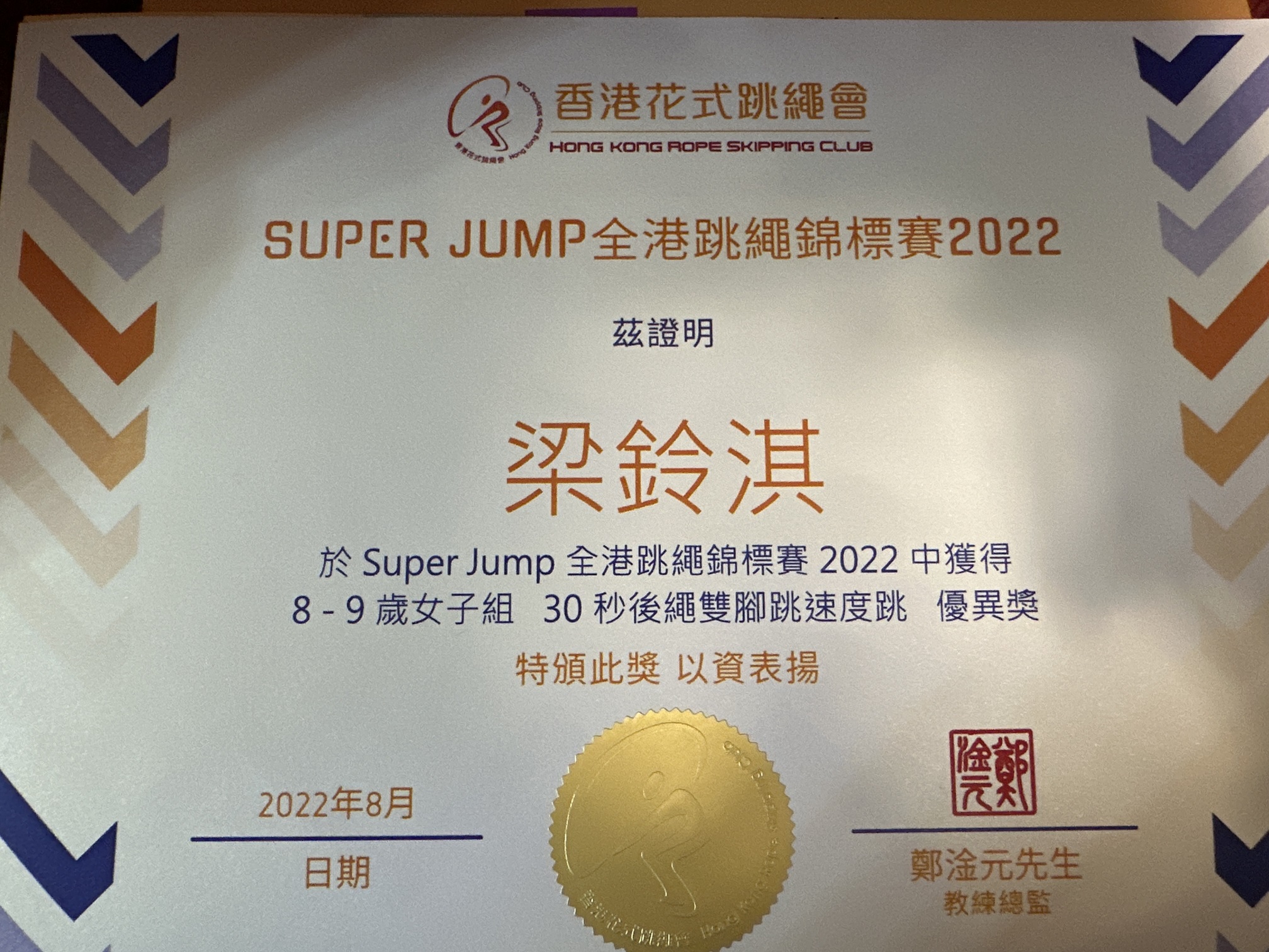 4B_梁鈴淇_SUPER JUMP 全港跳繩錦標賽2022_8~9歲女子組 30秒後繩雙腳跳速度跳_優異獎