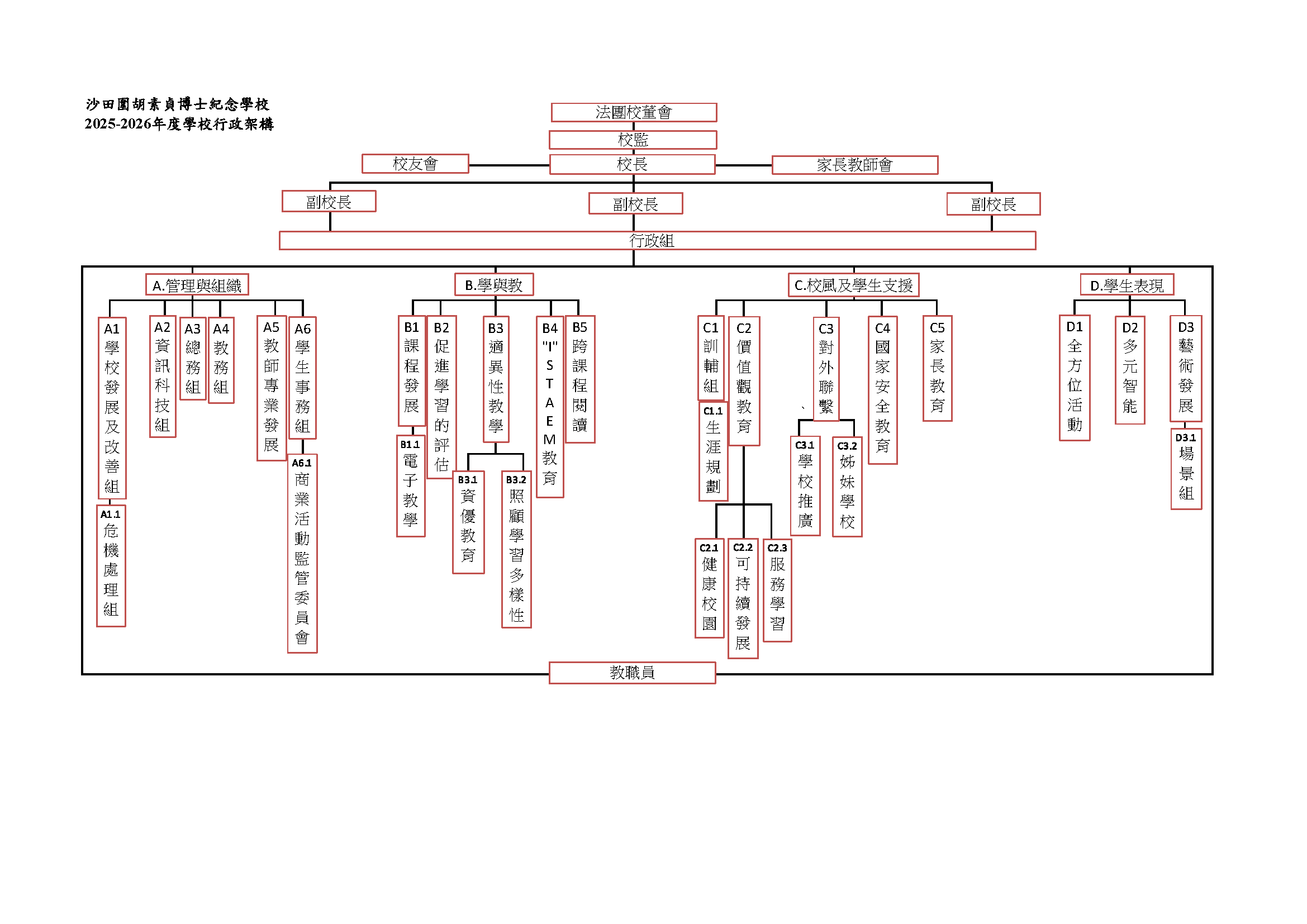 設立學校管理與組織、學與教、校風及學生支援、學生表現等工作小組,與各持份者共同訂定學校發展計劃,跟進檢討及改善。