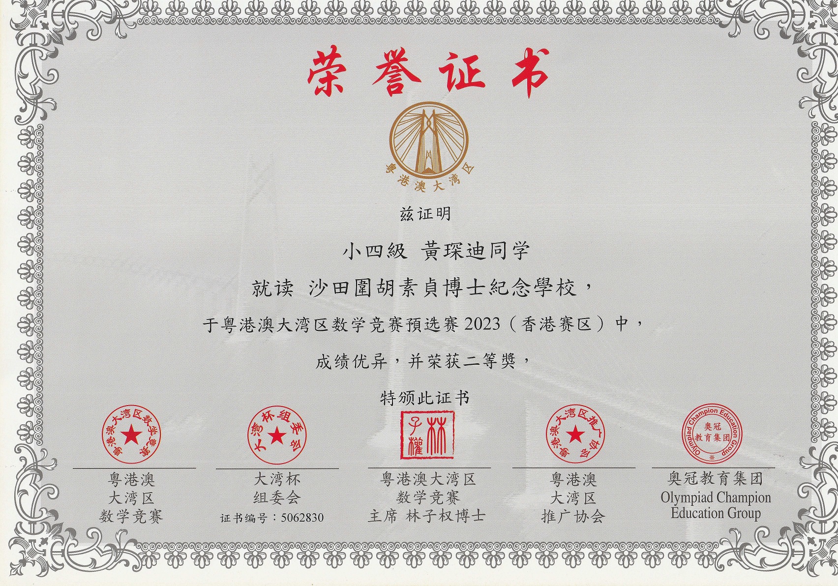 4A_黃琛迪_粵港澳大灣區數學競賽預選賽 2023(香港賽區)_小四級 _二等獎