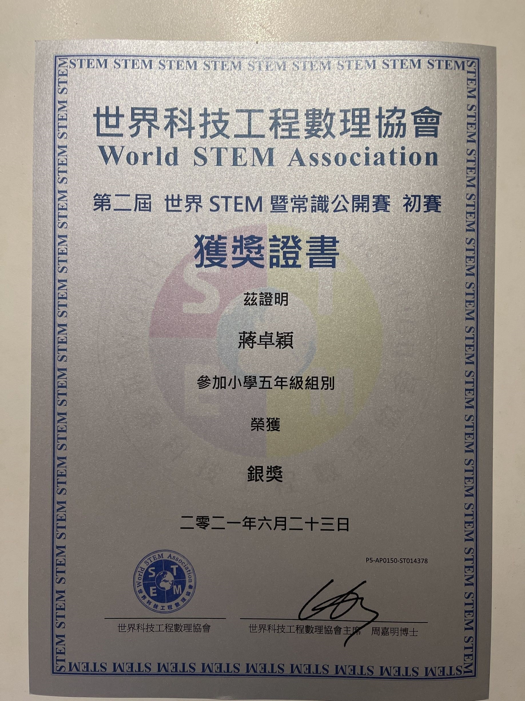 6C _蔣卓穎_ 第二屆 世界STEM暨常識公開賽 初賽_ 小學五年級_ 銀獎