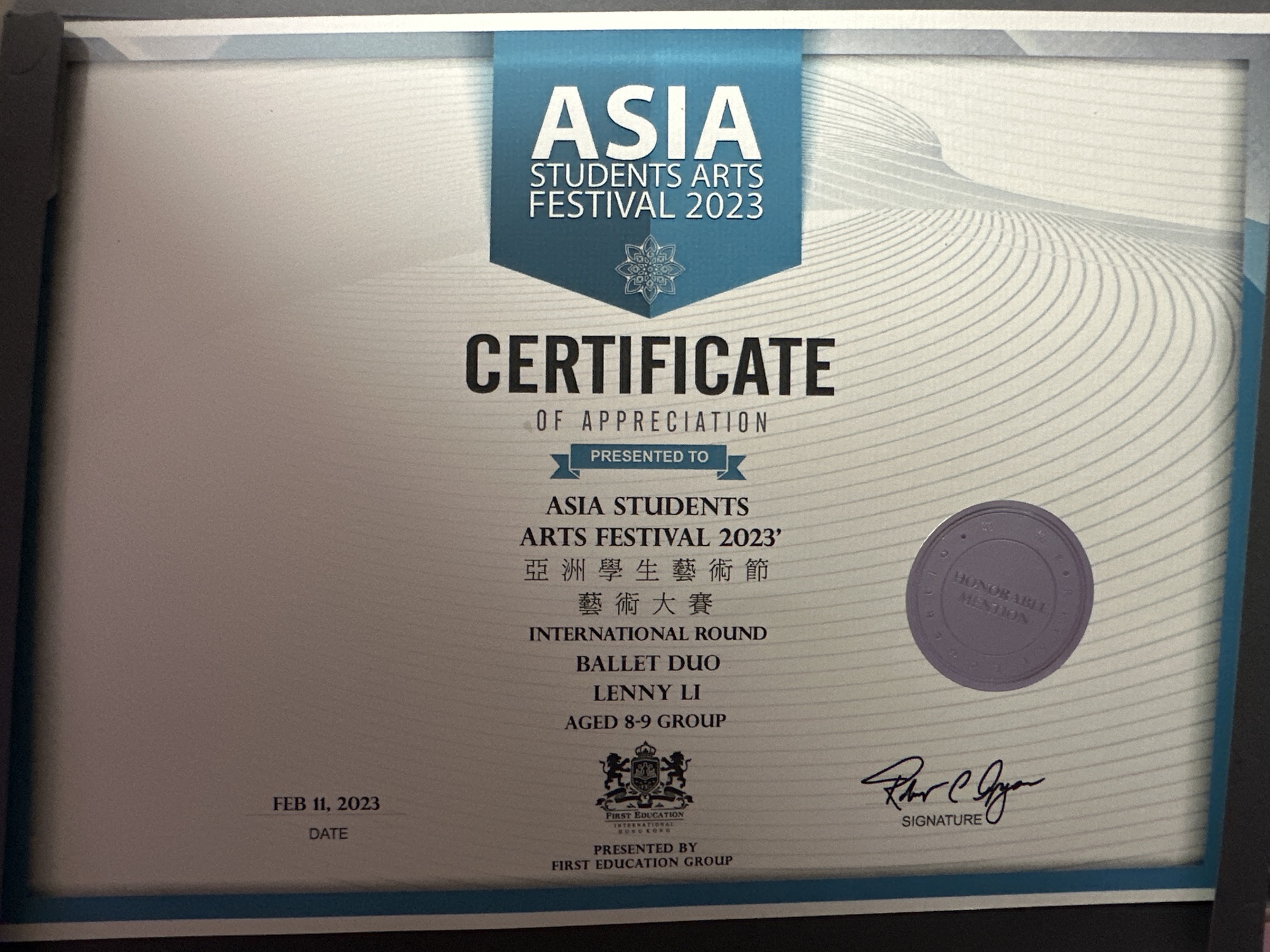 3D_李宛霖_ASAF亞洲學生藝術節_藝術大賽2023芭蕾舞_8-9歲組雙 人舞_榮譽獎