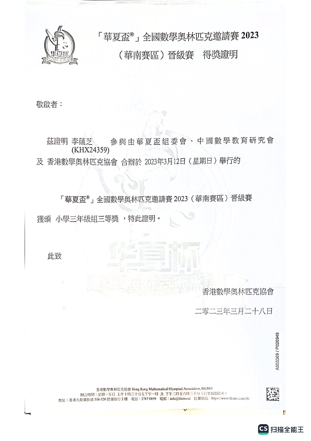 3A_李蘊芝_華夏盃全國數學奧林匹克邀請賽2023華南賽區晉級賽_小學三年級_三等獎