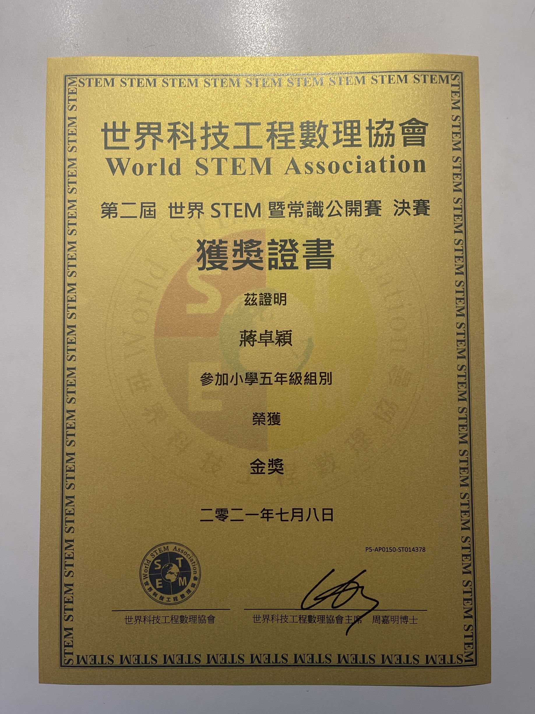 6C _蔣卓穎_ 第二屆 世界STEM暨常識公開賽 決賽_ 小學五年級_ 金獎