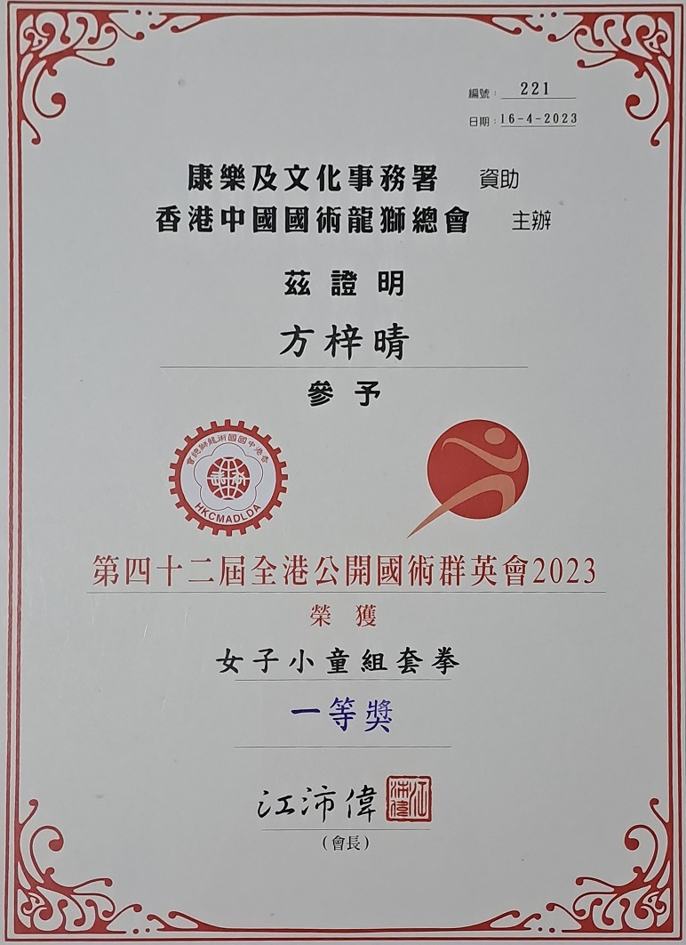 5D_方梓晴_第四十二屆全港公開國術群英會2023_女子小童組套拳_一等獎