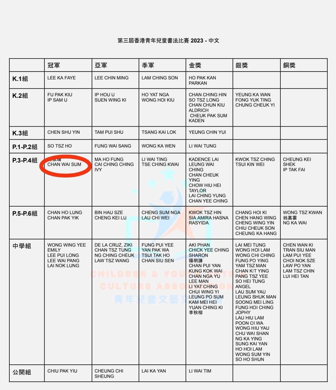 4B_陳尉心_香港青年兒童中文硬筆書法比賽小學_P.3-P.4組_冠軍