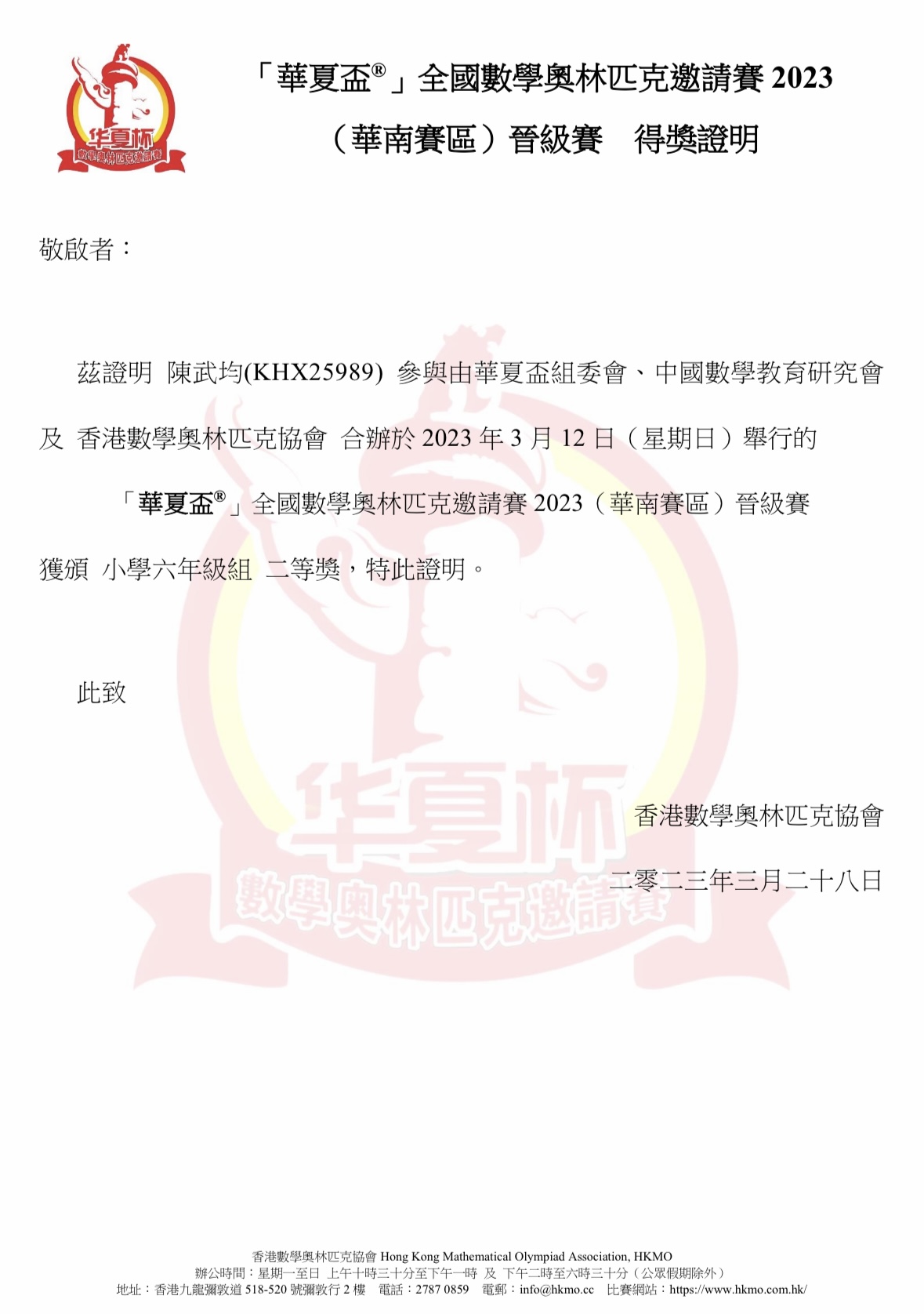 6C_陳武均_華夏盃 全國數學奧林匹克邀請賽 2023 (華南賽區)晉級賽_六年級組_二等獎