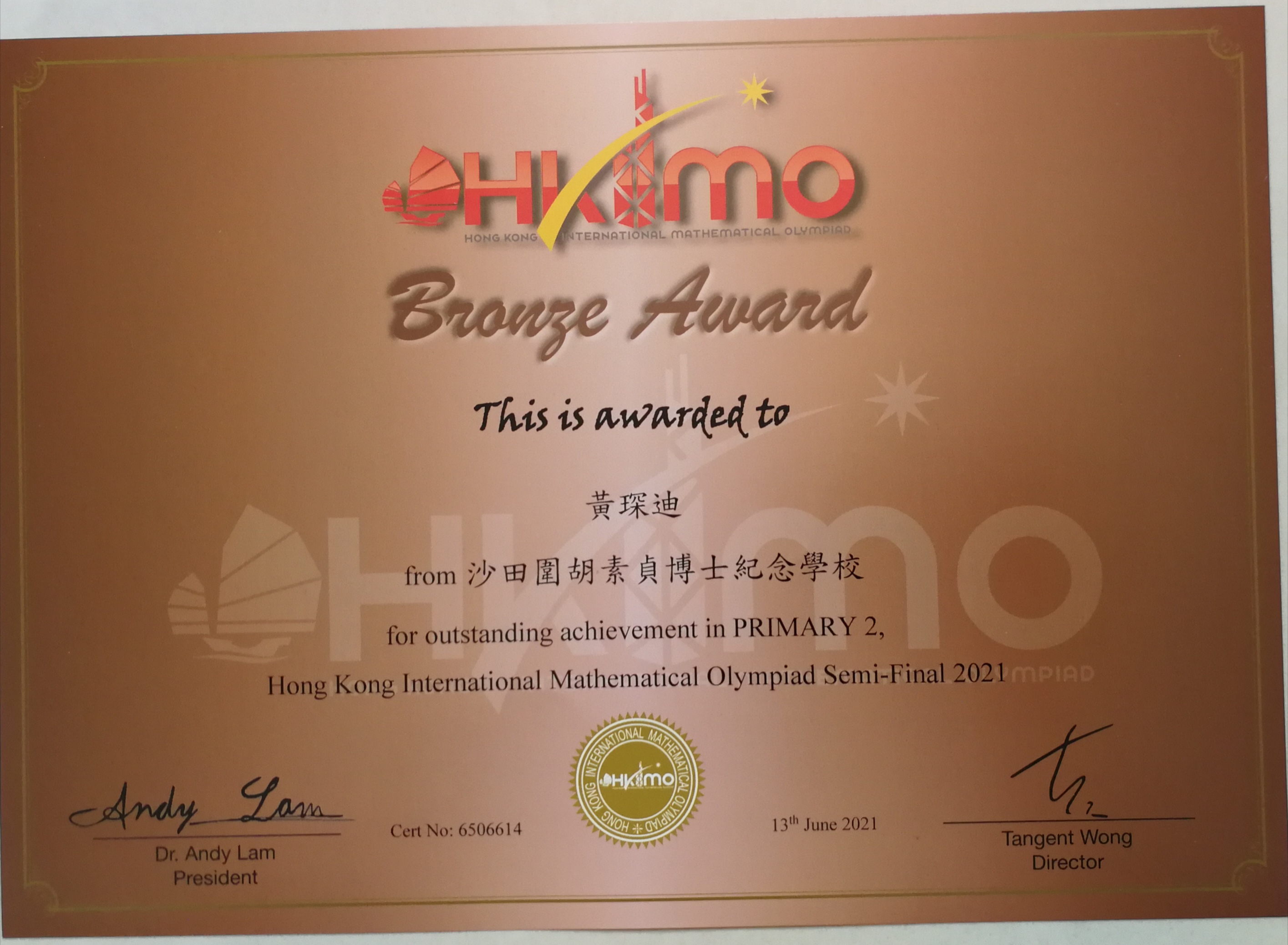3A _黃琛迪_ 香港國際數學競賽 晉級賽 2021_ 小二級_ 銅獎