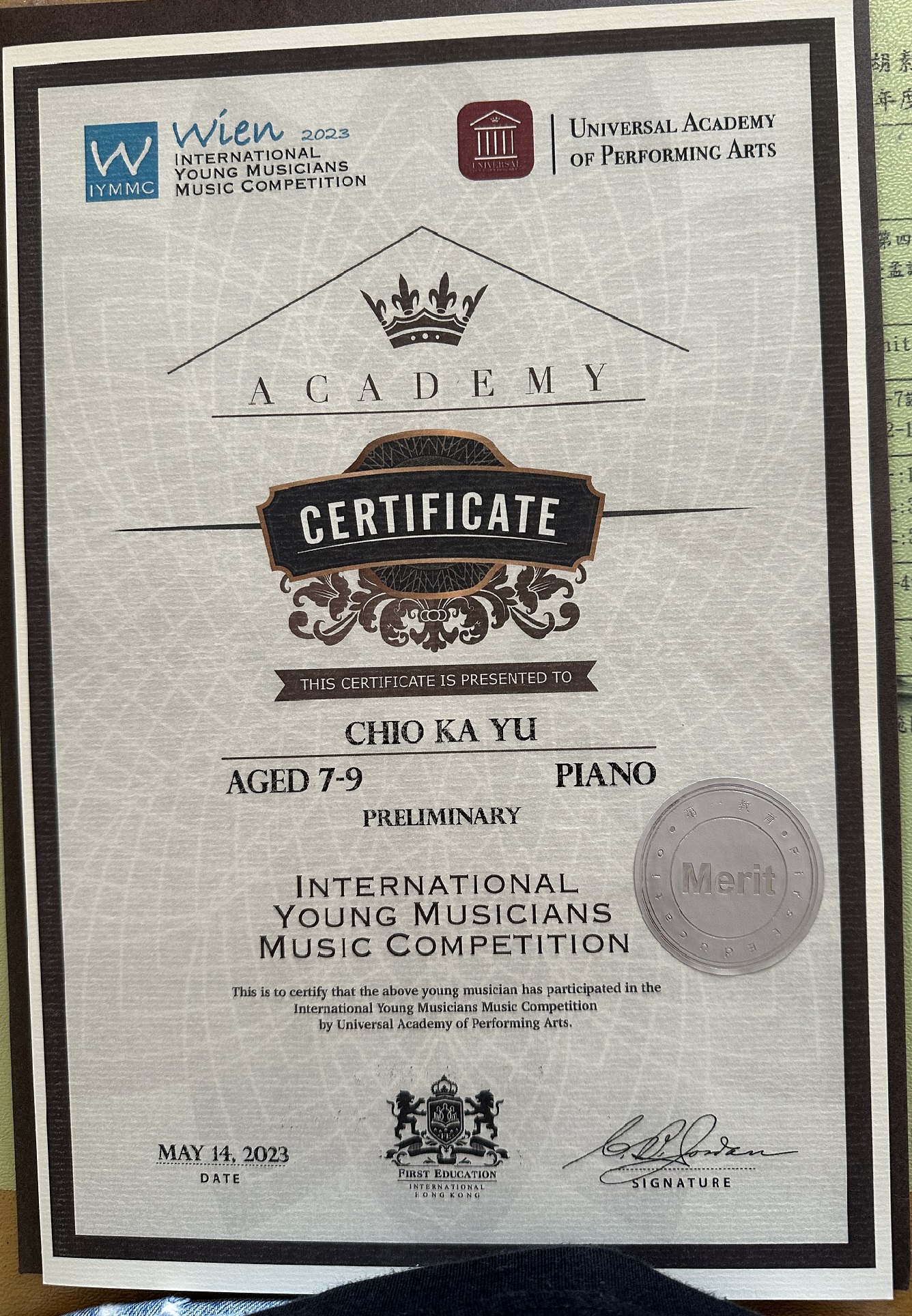 1B_趙嘉宇_維也納國際青年音樂家音樂大賽2023_鋼琴二級-Aged 7-9_優異
