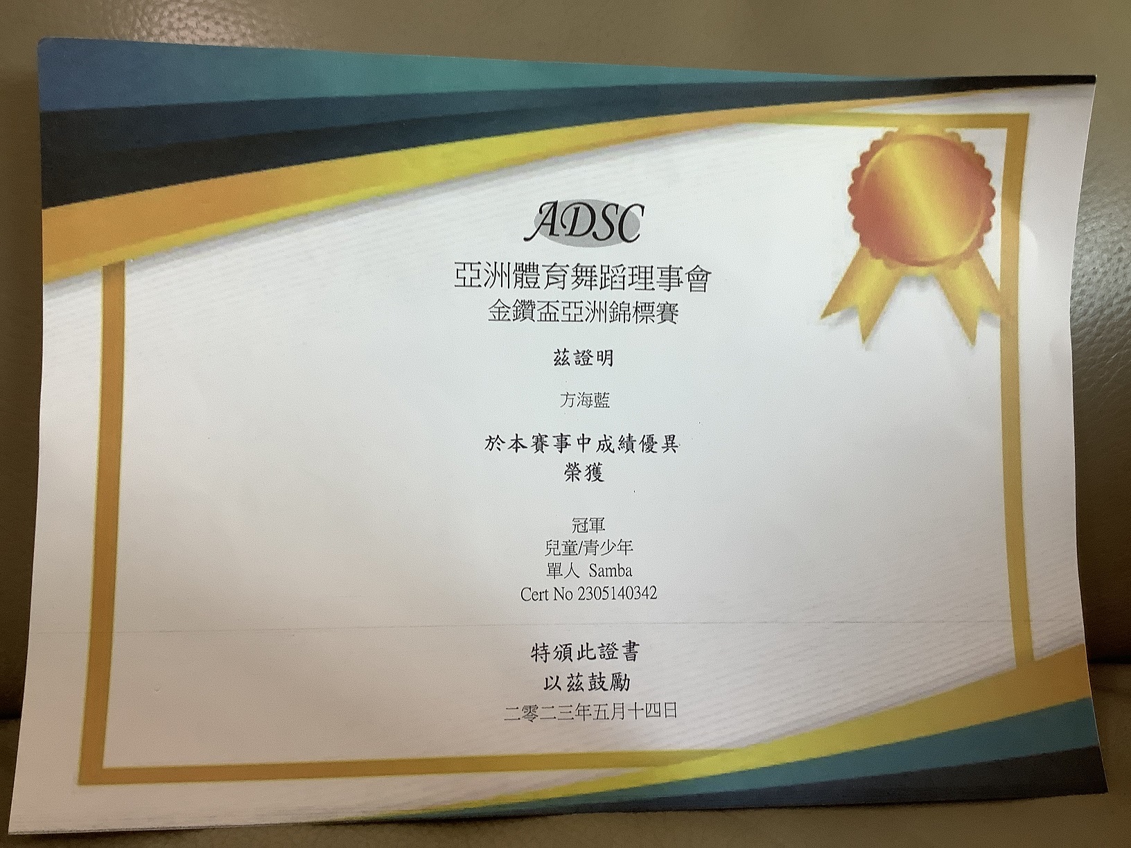2A_方海藍_亞洲體育舞蹈理事會金鑽盃亞洲錦標賽兒童/青少年_單人Samba_冠軍