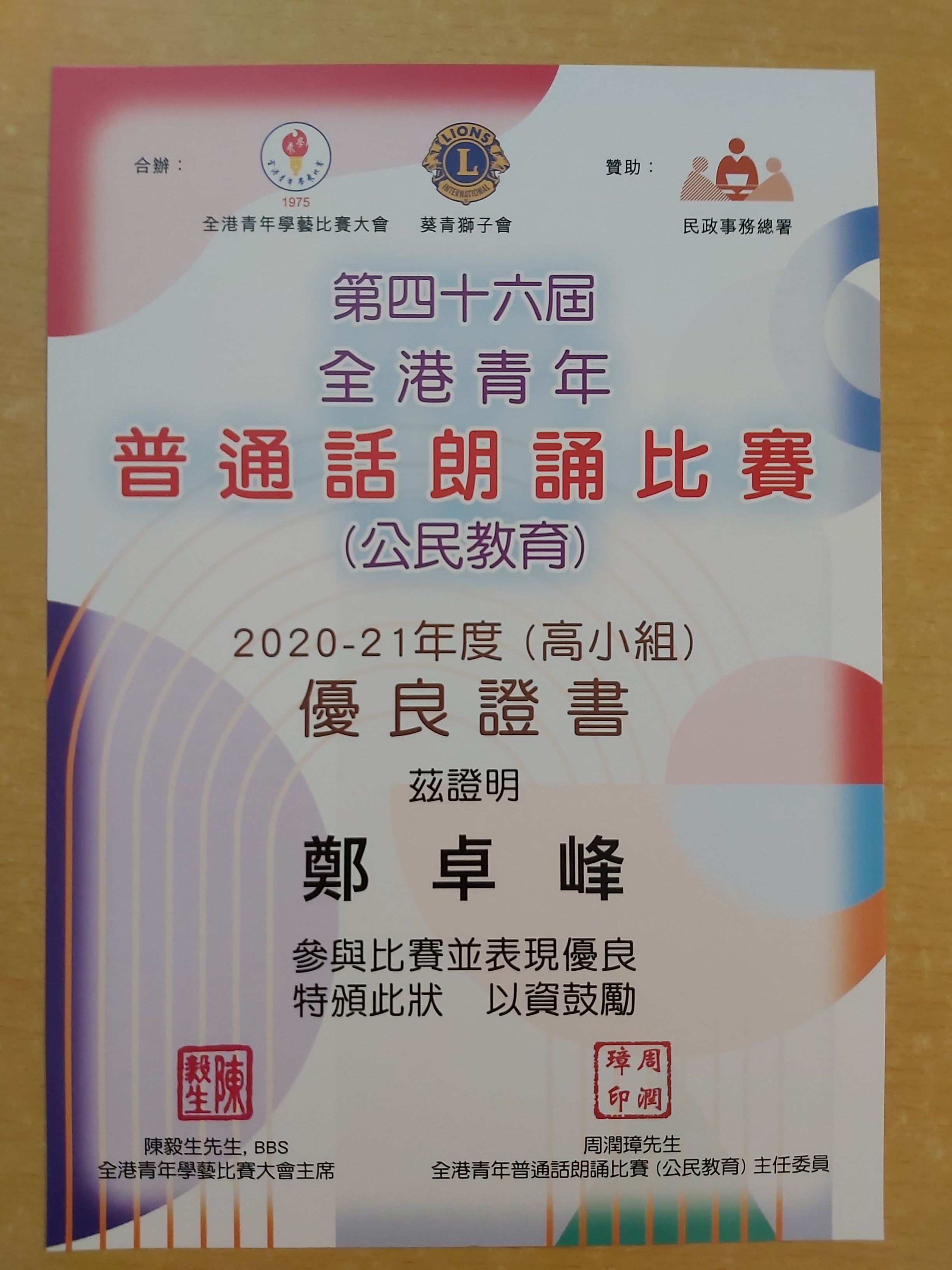 6D _鄭卓峰_ 第四十六屆全港青年普通話朗誦比賽(公民教育)_ 高小組_ 優良