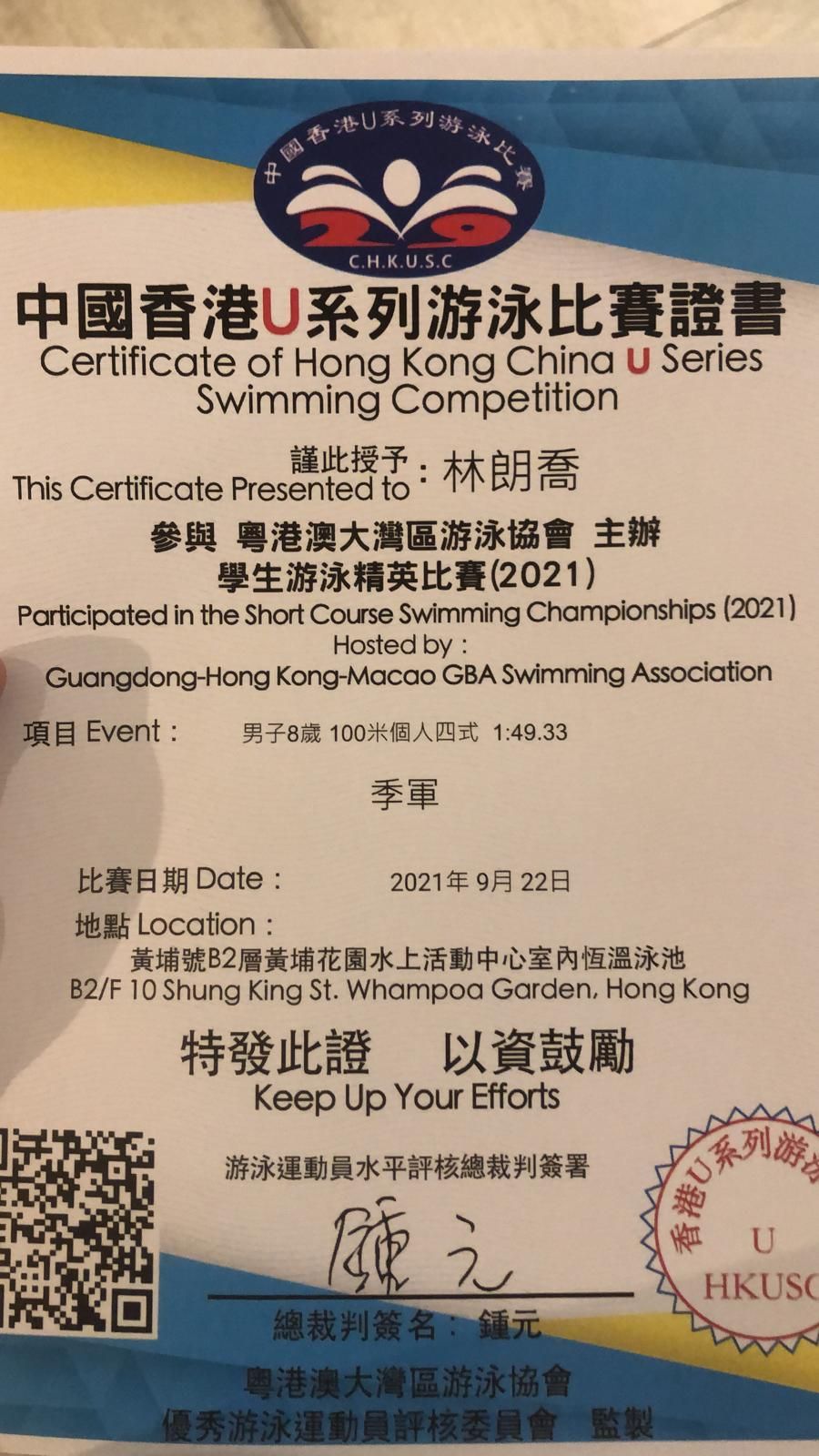 3B _林朗喬_ 中國香港U系列游泳比賽_ 男子8歲 100米個人四式_ 季軍
