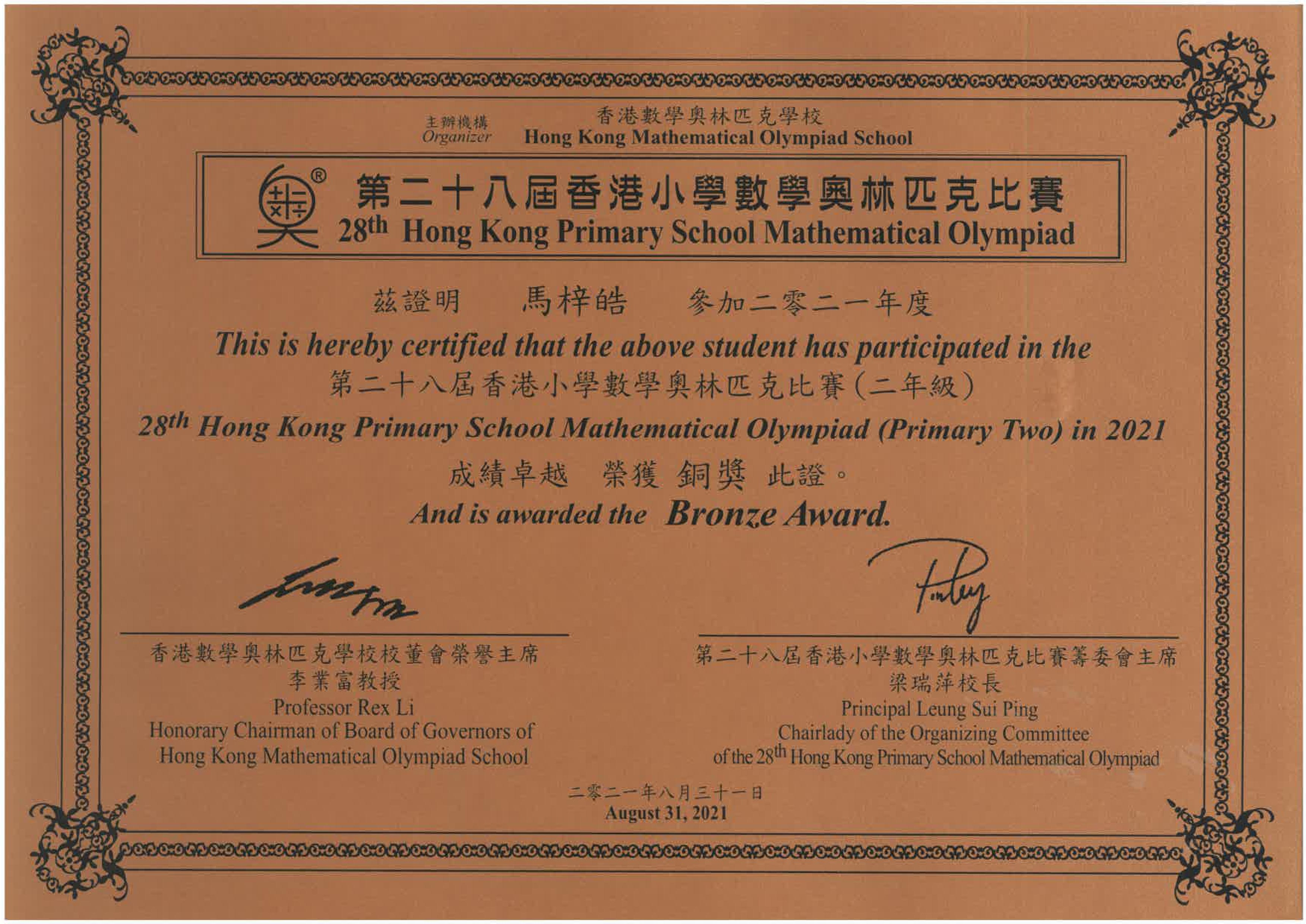 3A _馬梓皓_ 第二十八屆香港小學數學奧林匹克比賽_ 二年級組_ 銅獎