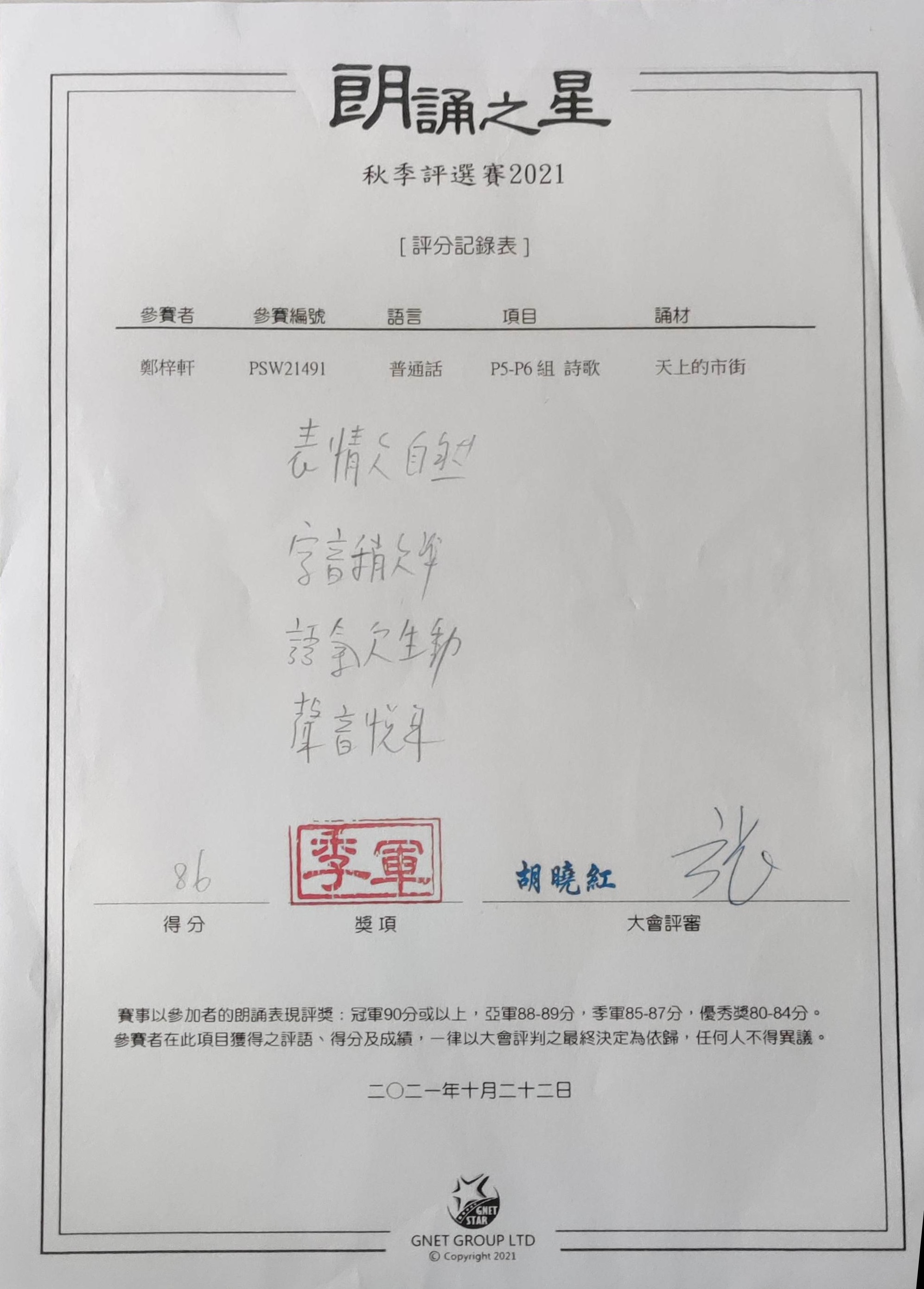 6D _鄭梓軒_ 朗誦之星秋季評選賽2021_ P5-P6組 詩歌_ 季軍
