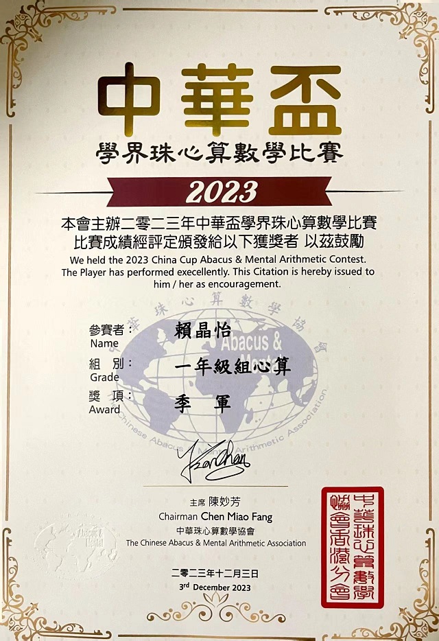 1B_賴晶怡_中華盃學界珠心算數學比賽_一年級組心算_季軍