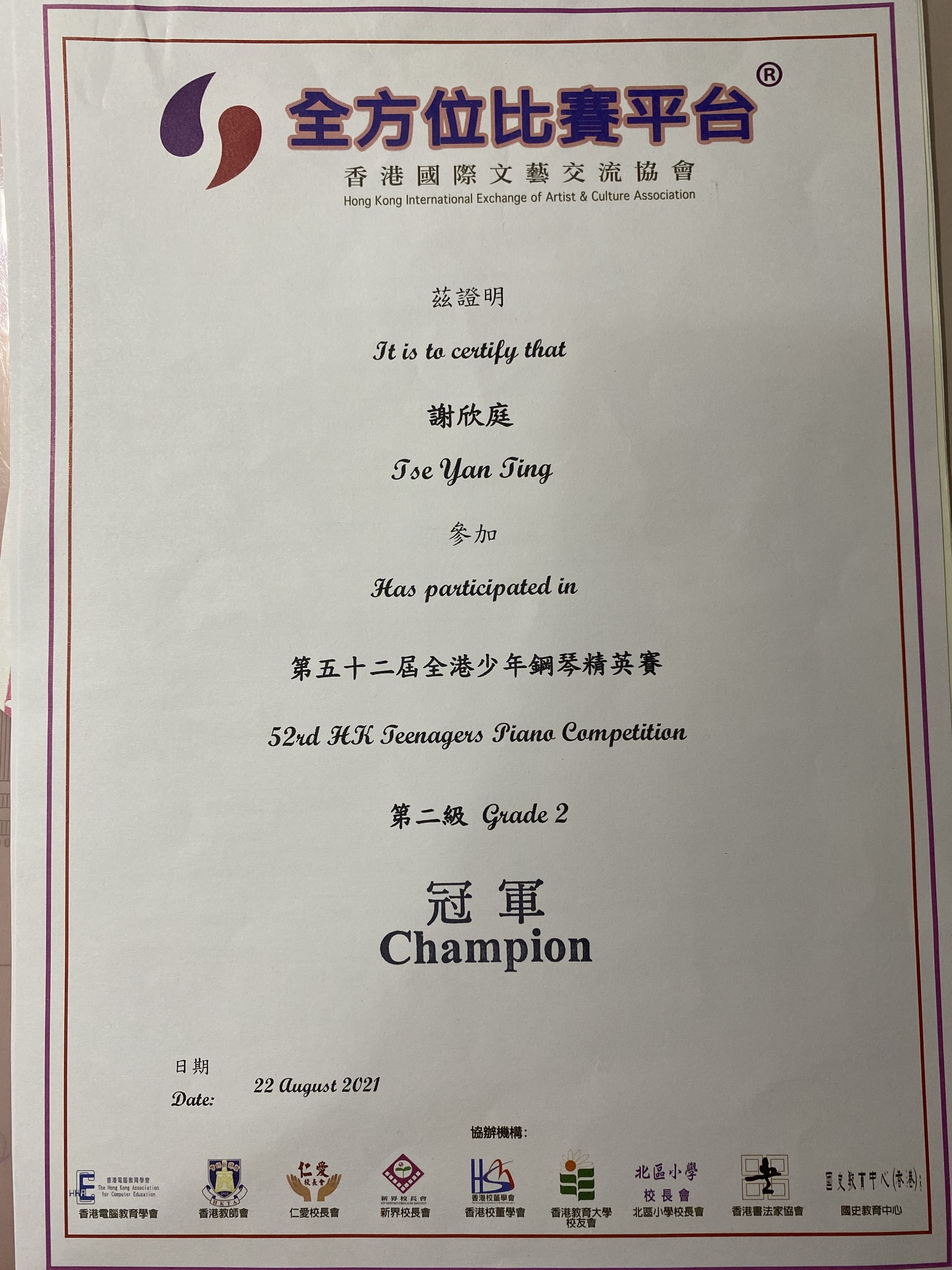 6A _謝欣庭_ 第五十二屆全港少年鋼琴精英賽_ 鋼琴第二級組_ 冠軍