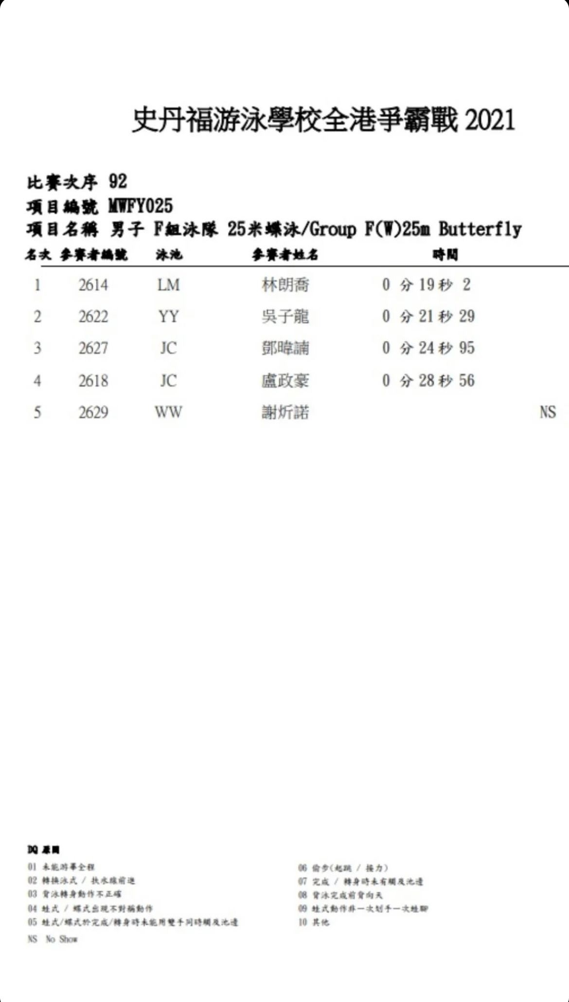 3B_林朗喬_史丹福游泳學校全港爭霸戰2021_男子F組泳隊25米蝶泳_冠軍