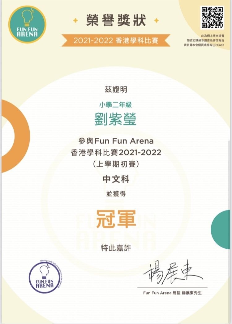 2B_劉紫瑩_香港學科比賽2021-2022(上學期初賽)中文科_小學二年級_冠軍