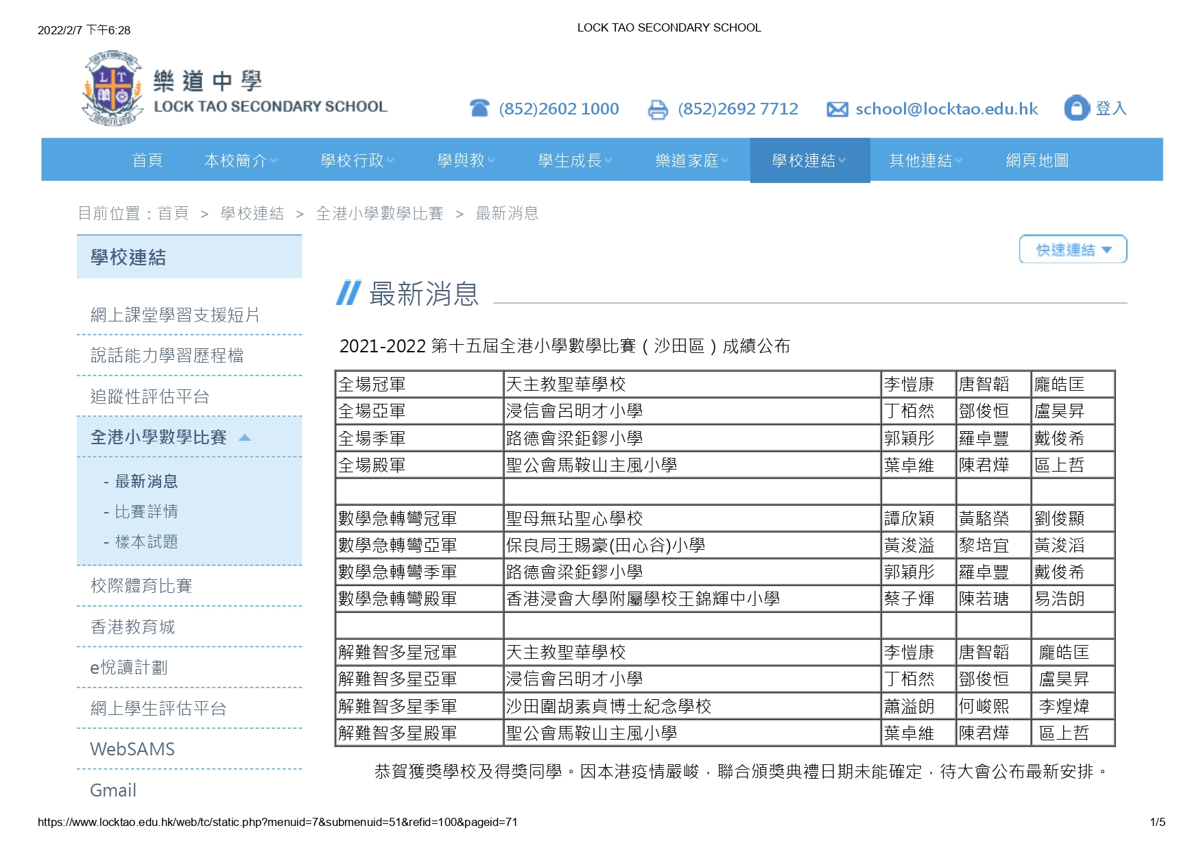 | 2021-2022 第十五屆全港小學數學比賽 | 香港理工大學應用數學系、樂道中學 | 6C 何峻熙 | 2021-12-11 | 小六年級 | 季軍 | ||