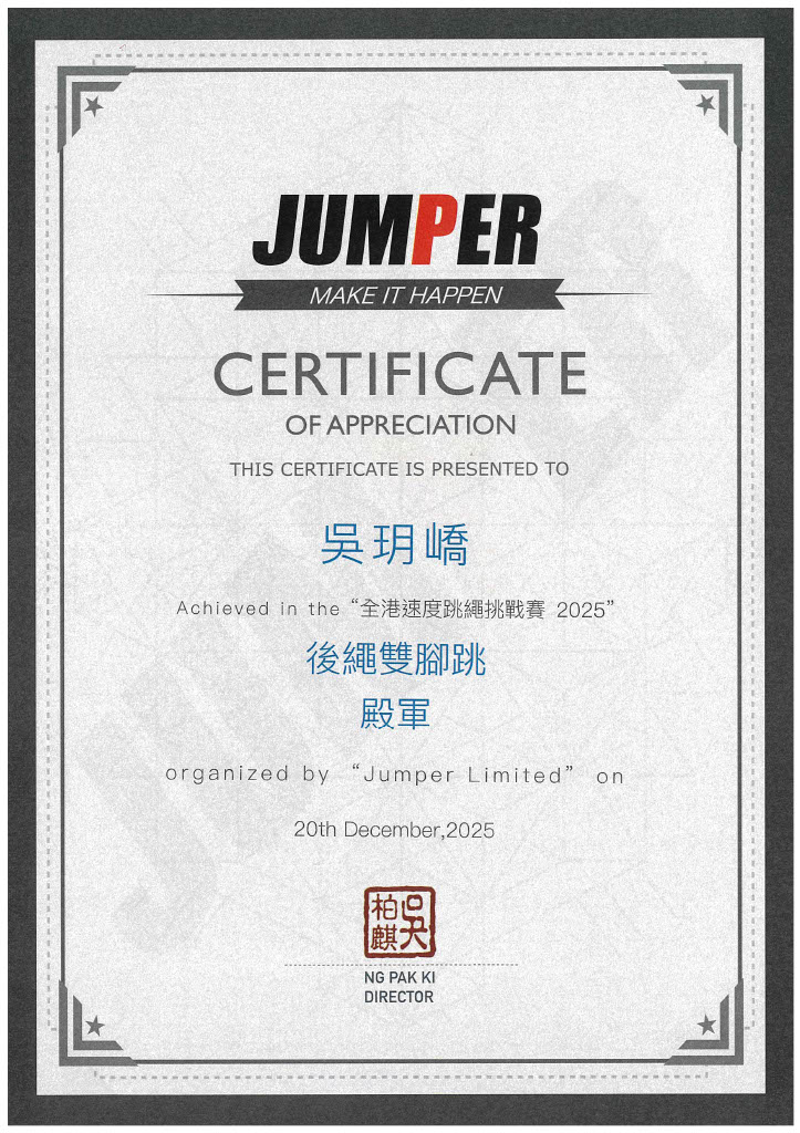 1D_吳玥嶠_全港速度跳繩挑戰賽2025_6歲或以下女子組 後繩雙腳跳 _殿軍