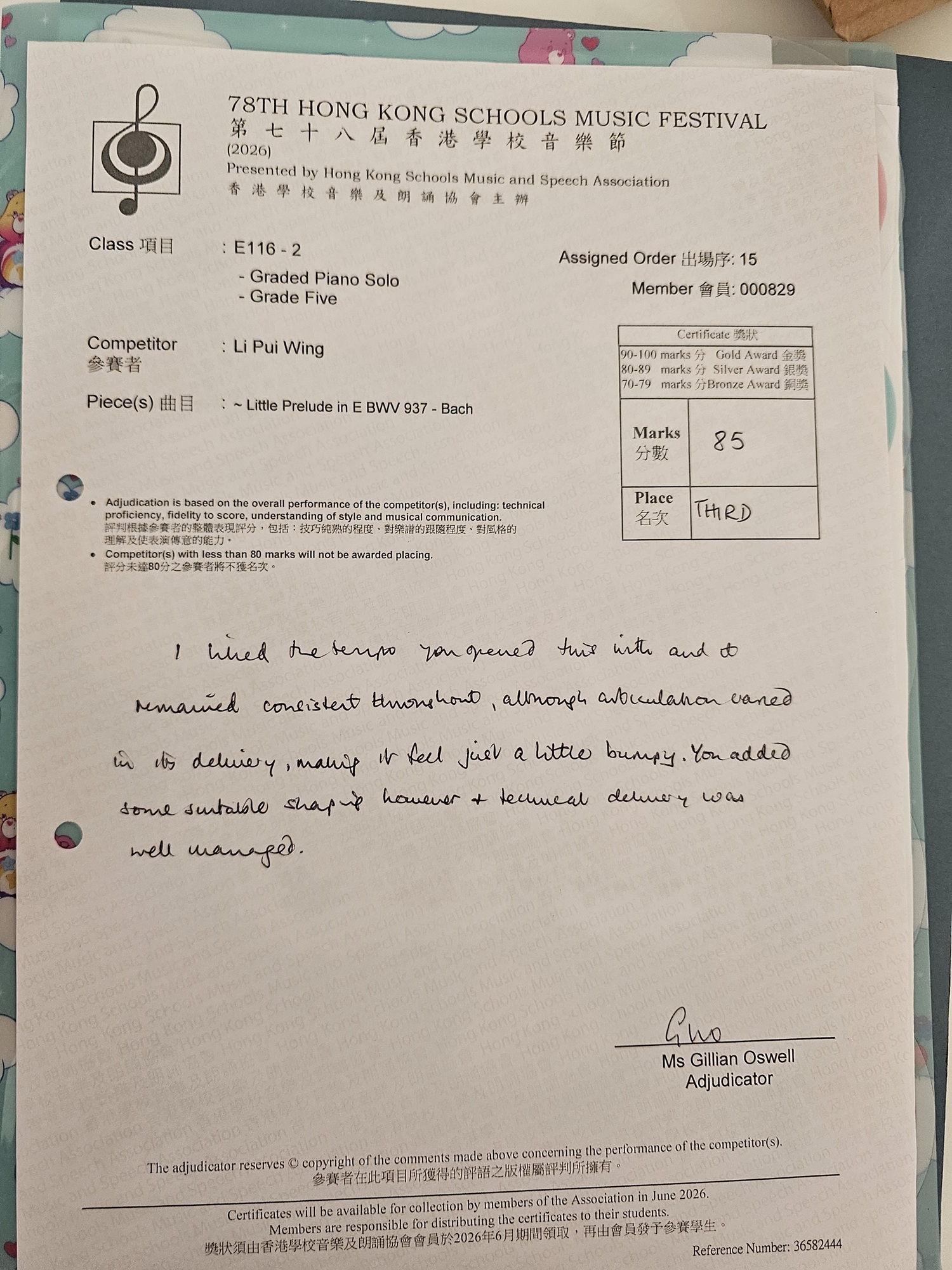 5D_李沛穎_第78屆香港學校音樂節_5級鋼琴獨奏_季軍