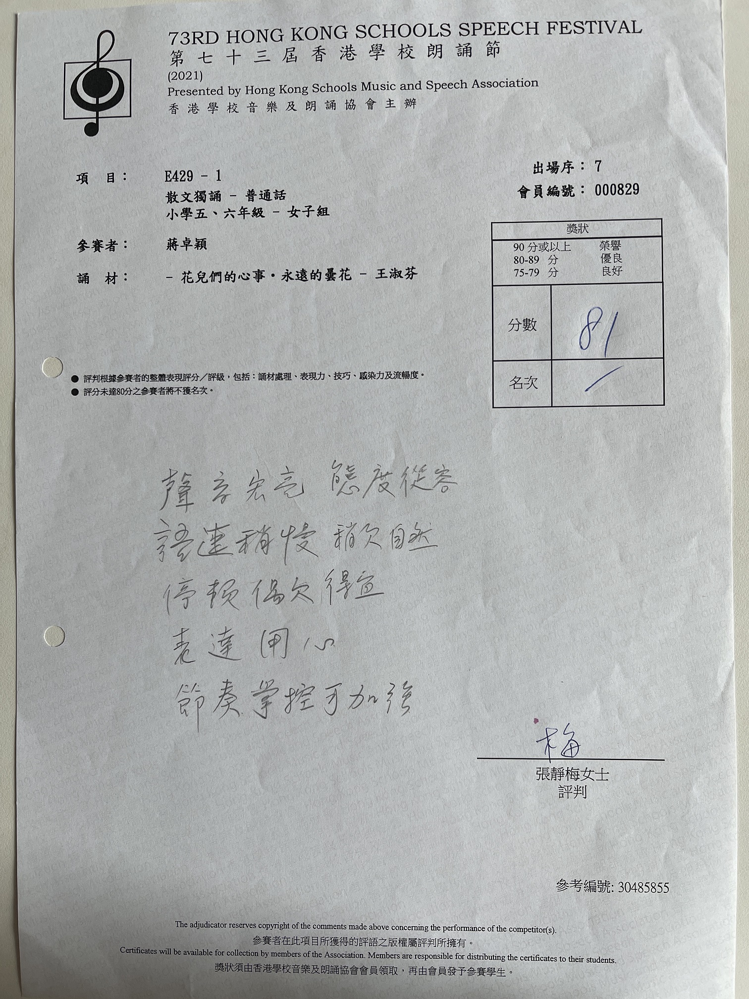 香港學校音樂及朗誦協會 | 6C 蔣卓穎 |