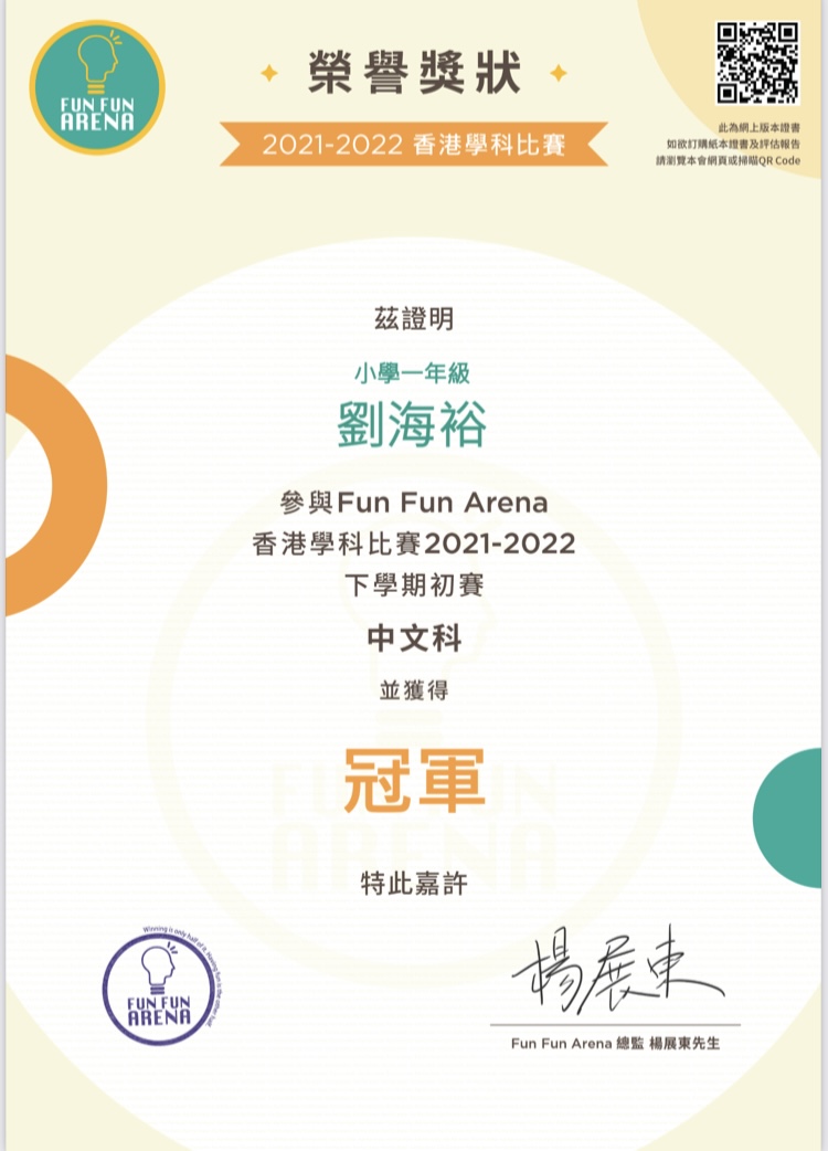 1B_劉海裕_2021-2022 香港學科比賽(下學期初賽)中文科_小學一年級_ 冠軍