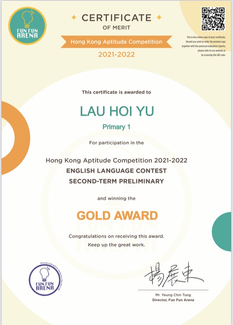 1B_劉海裕_2021-2022香港學科比賽(下學期初賽)英文科_小學一年級_金獎