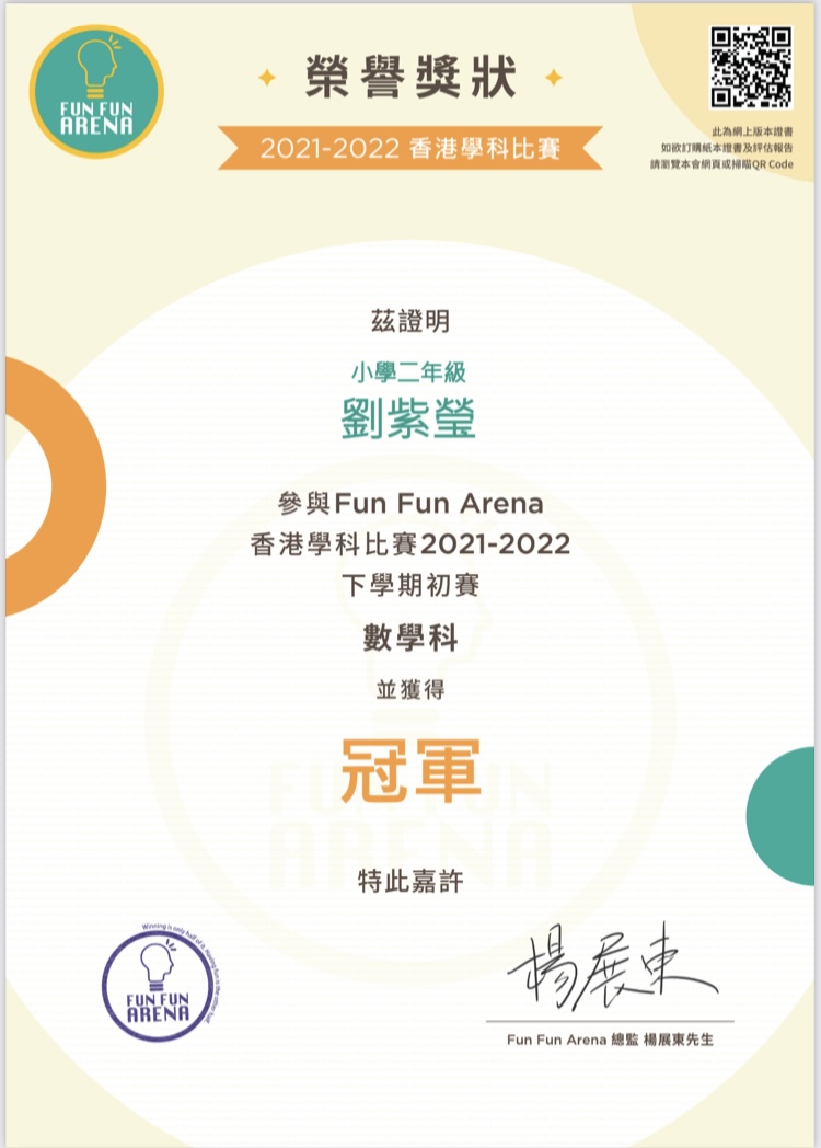 2B_劉紫瑩_2021-2022 香港學科比賽(下學期初賽) 數學科_小學二年級_冠軍