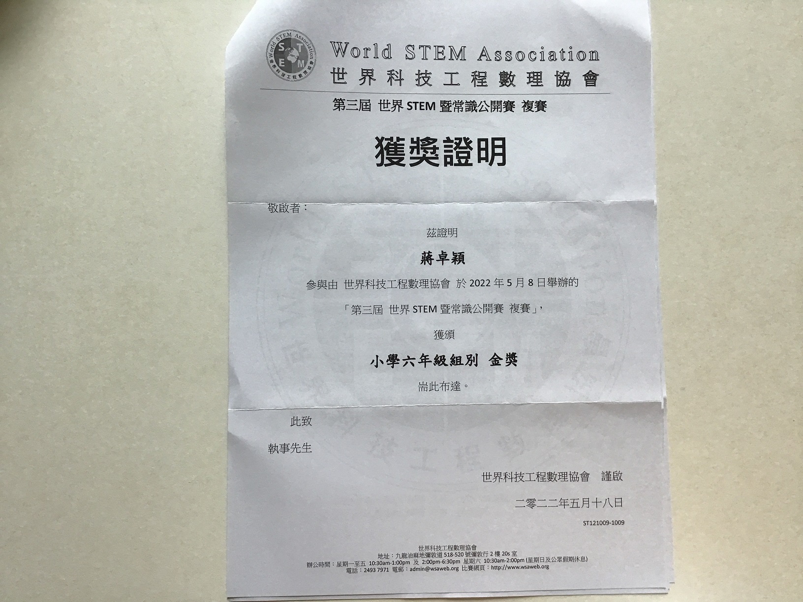 6C_蔣卓穎笫_三屆世界STEM暨常識公開賽複賽_小六組_金獎