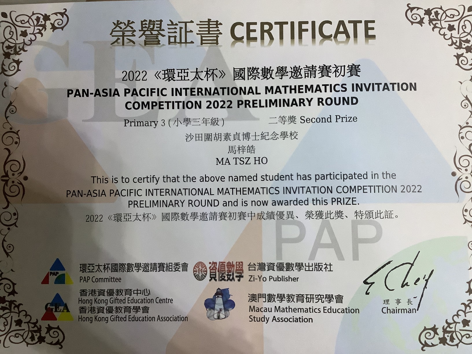 3A_馬梓皓_ 2022環亞太杯國際數學邀請賽初賽 _小學三年級組_二等獎