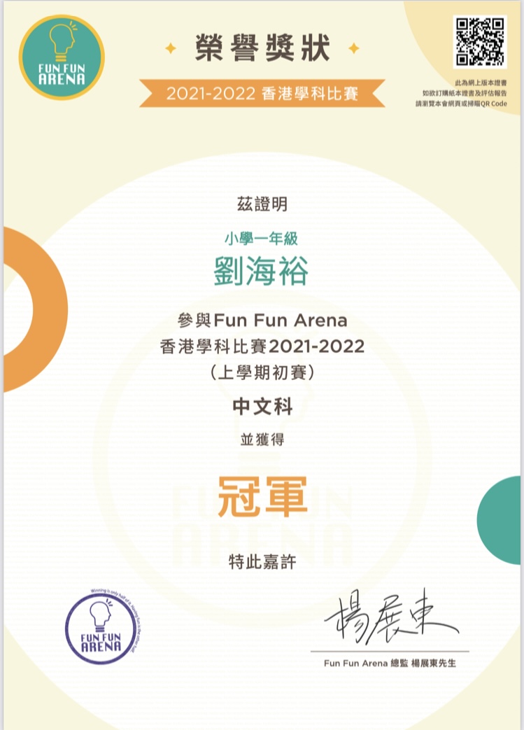 1B_劉海裕_香港學科比賽2021-2022(上學期初賽)_中文科小學一年級_冠軍