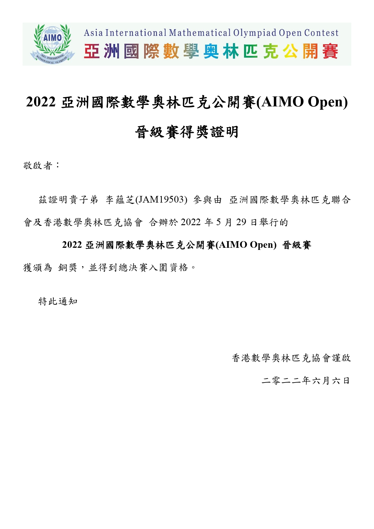 2B_李蘊芝_2022亞洲國際數學奧林匹克公開賽(AIMO Open)晉級賽_銅獎