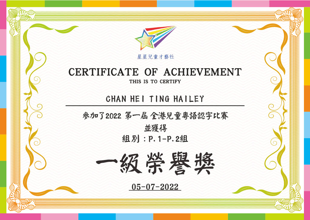 1A_陳熙廷_2022第一屆全港兒童粵語認字比賽_P.1-P.2組_一級榮譽獎