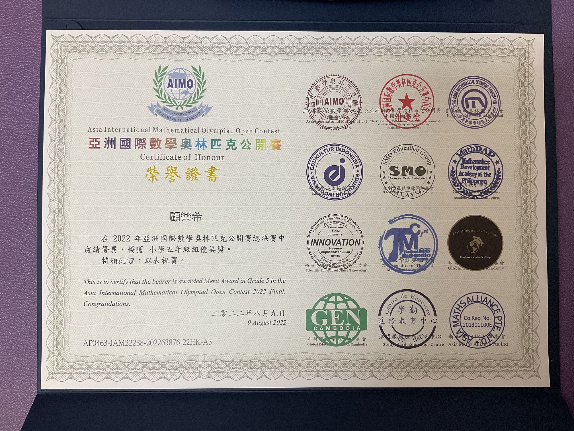 6B_顧樂希_亞洲國際數學奧林匹克公開賽總決賽_小學五年級組_優異獎