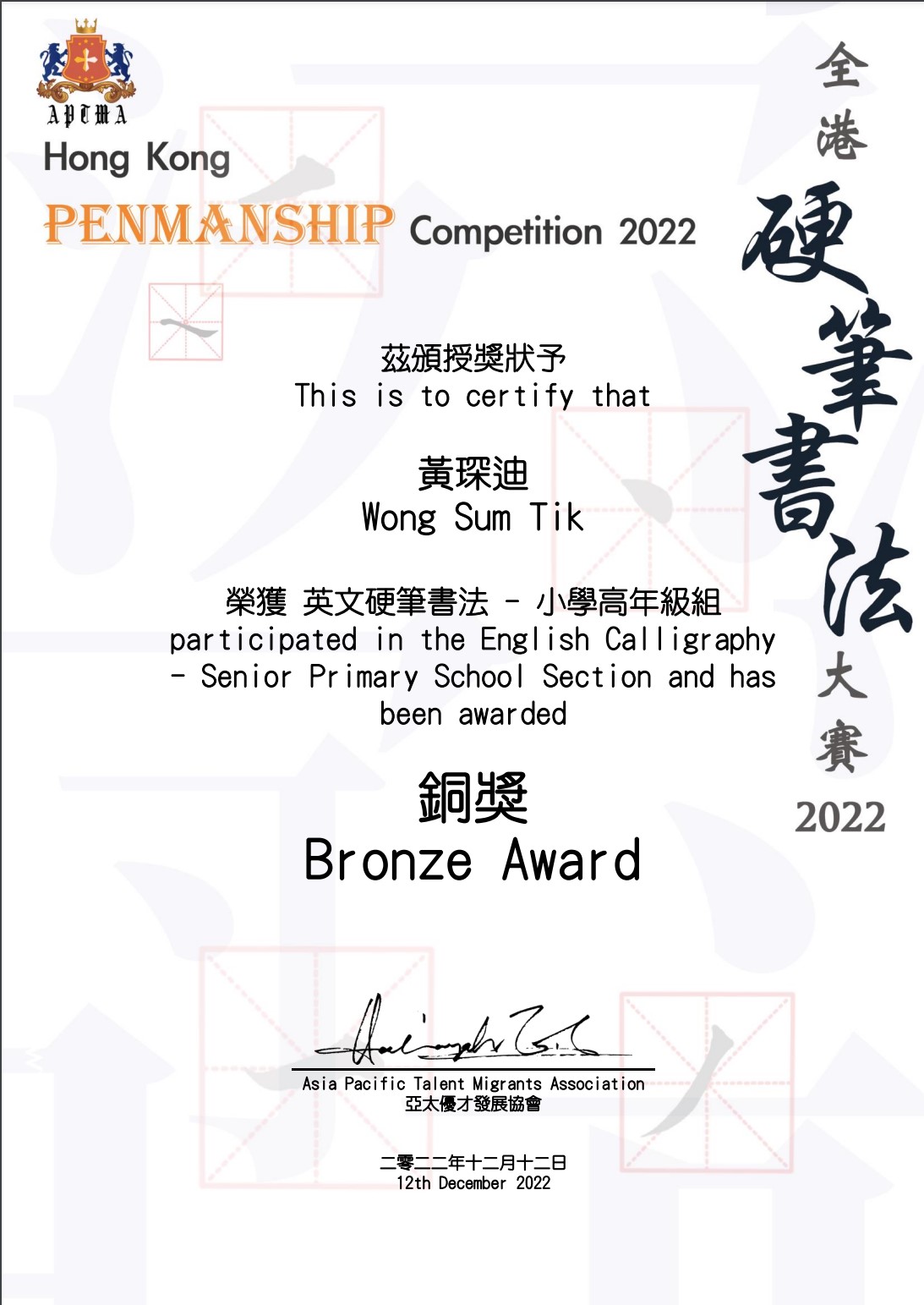 4A_黃琛迪_ 全港硬筆書法大賽2022_ 英文硬筆小學高年級組_銅獎