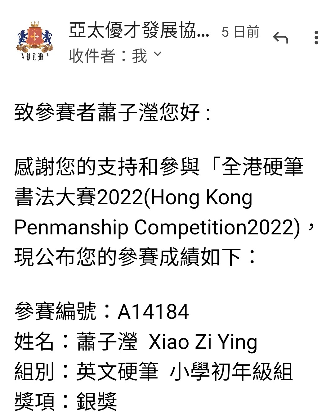 2A_蕭子瀅_全港硬筆書法大賽2022 英文硬筆_小學初年級組_銀獎