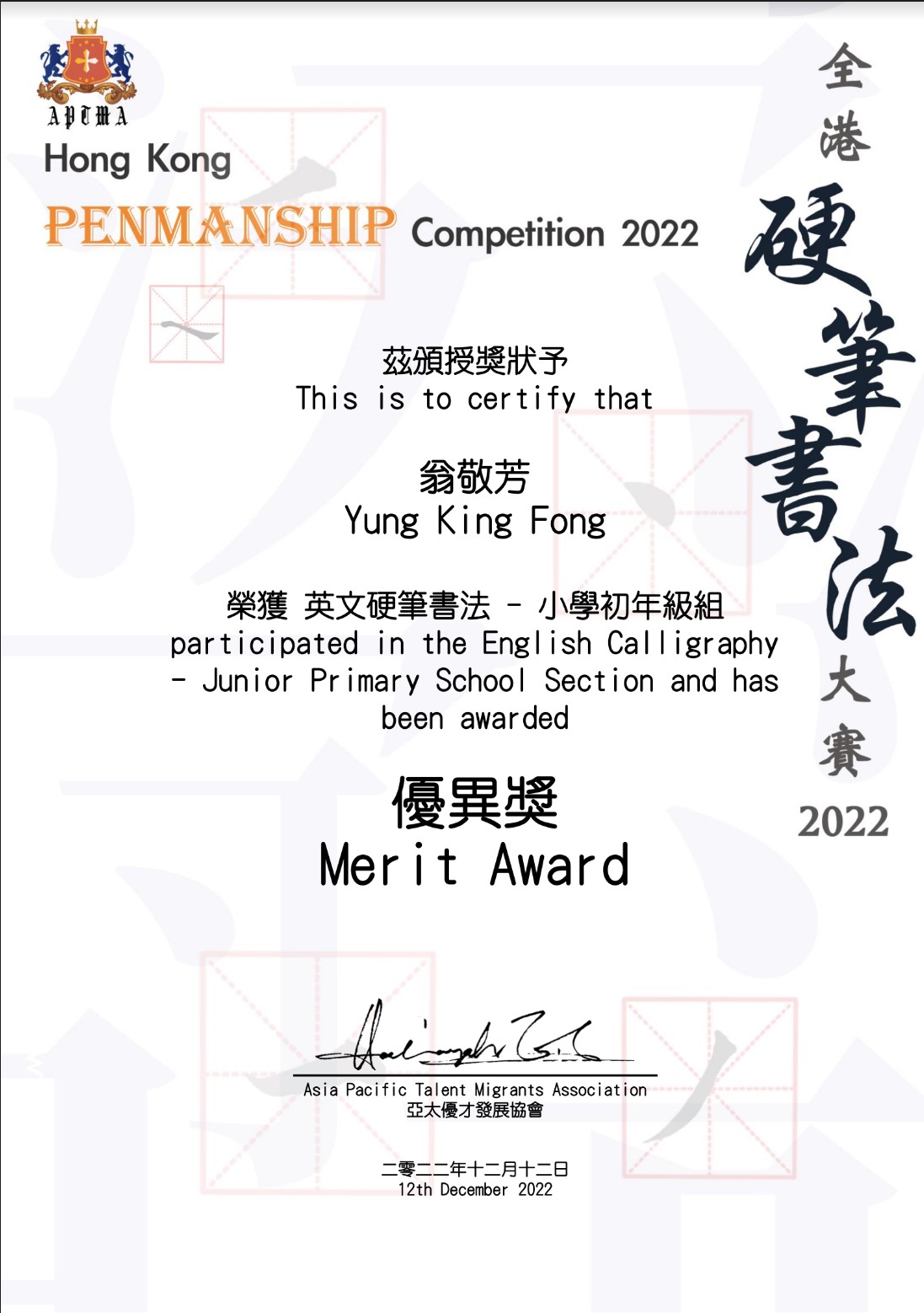 英文硬筆小學初年級組 | 優異獎 | ||
