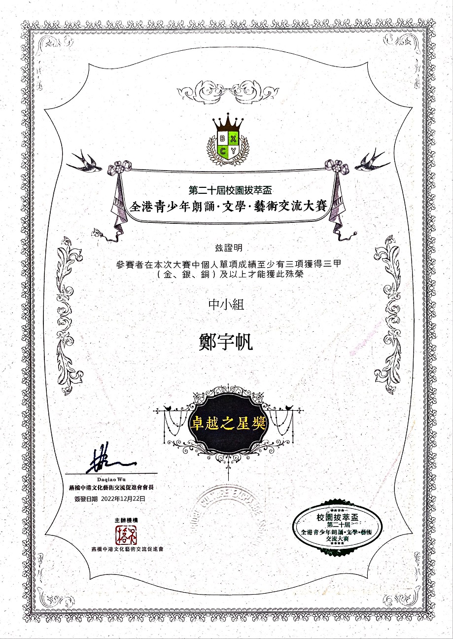 4A_鄭宇帆_第二十屆校園拔萃盃全港青少年朗誦文學藝術交流大賽_中小組 _卓越之星獎(個人單項有三項獲得三甲)